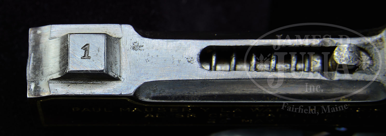 BEAUTIFUL PRESENTATION MAUSER ZIG-ZAG REVOLVER, GOLD LINE ENGRAVING, SN 1, CASED WITH ACCESSORIES.SN 1. Cal. 7.6 Mauser. Standard configuration Zig-Zag with 5-1/4″ keyhole shaped bbl with integral front and rear sight. Top strap marked “”GEBR. MAUSER & CIE OBENDORF A/N WURTTEMBERG 1878”. The left side of frame is presentation inscribed “PAUL MAUSER Y LA WAFFENFABRIK MAUSER AG / AL SR CAL. PABLO RICCHERI / 25 MAYO 1891”. The SN “1” is present on the inside of the dismounting lever, the inner face of cylinder and on top of frame lug. Revolver has been extraordinarily well polished to a brilliant midnight blue with bright fire blued hammer, safety, dismounting lever, trigger and screws. Gold line highlighting of all inscriptions and borders, to include the Zig-Zag cut-outs on cylinder, front and back strap, with accenting of the hammer and dismounting lever. Fitted with hard rubber grips, each panel molded to have a dragon and vine motif. Presented in a French fitted wood case whose lid has an inserted plaque with intertwined initials “PR”, lined in dark blue velvet with compartmentalized base for pistol, screw driver, 18 rnd ammo block, and minor accessories. PROVENANCE: The Friedrich-Wilhelm Dauphin Collection – Germany. CONDITION: Customized Zig-Zag revolver now presents near new with only the most minute sharp edge wear around the dismounting lever. Grips are nearly as good with deeply impressed and dramatic pattern, no chips or cracks. Dull bore with very shallow rifling. Perfect manual mechanics. Presentation case, screw driver and associated wooden inserts in excellent condition. A beautifully embellished small frame Zig-Zag, with a great SN, in a well appointed and appropriately aged presentation case that should appeal to every collector. 49828-158 LMA (7,500-12,500) – Lot 1527
