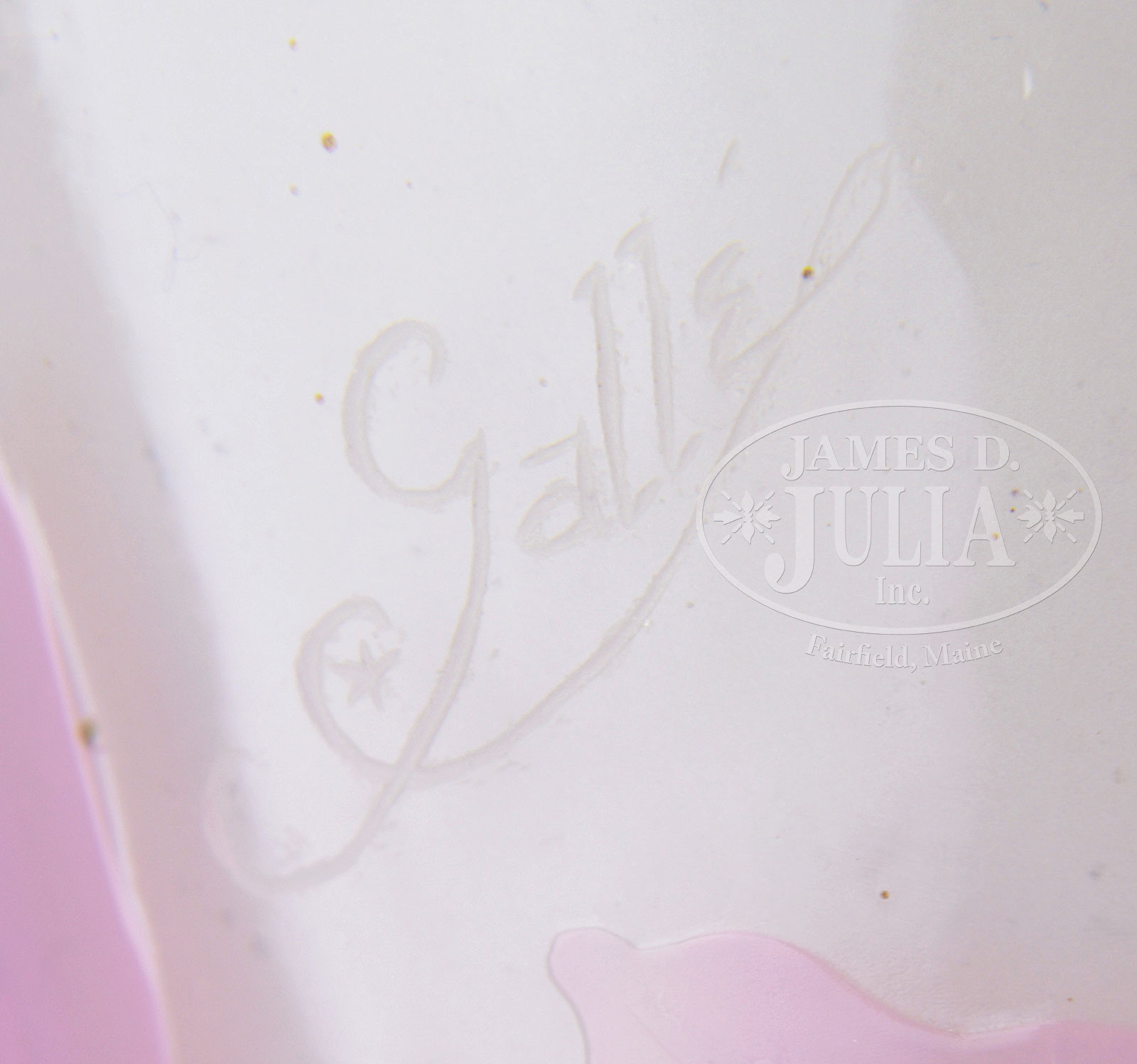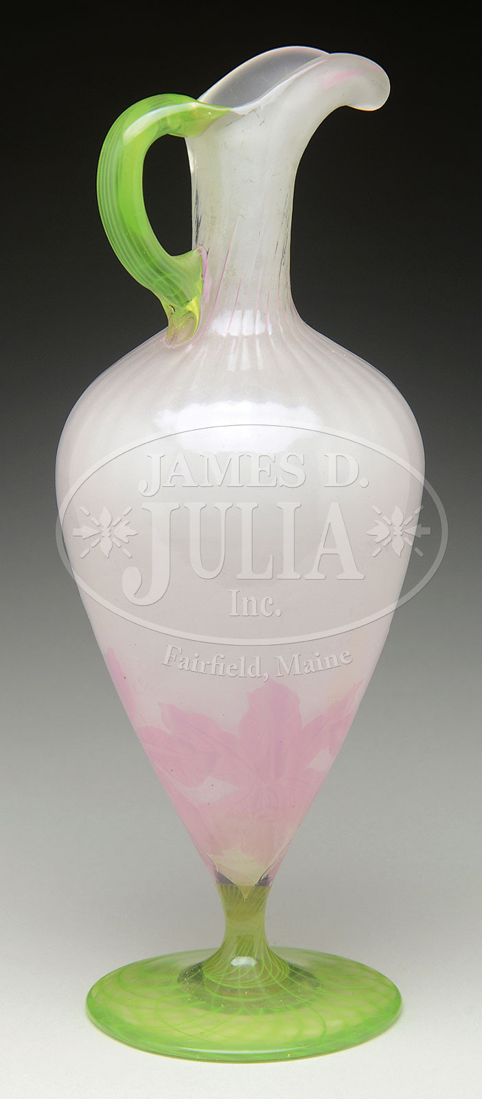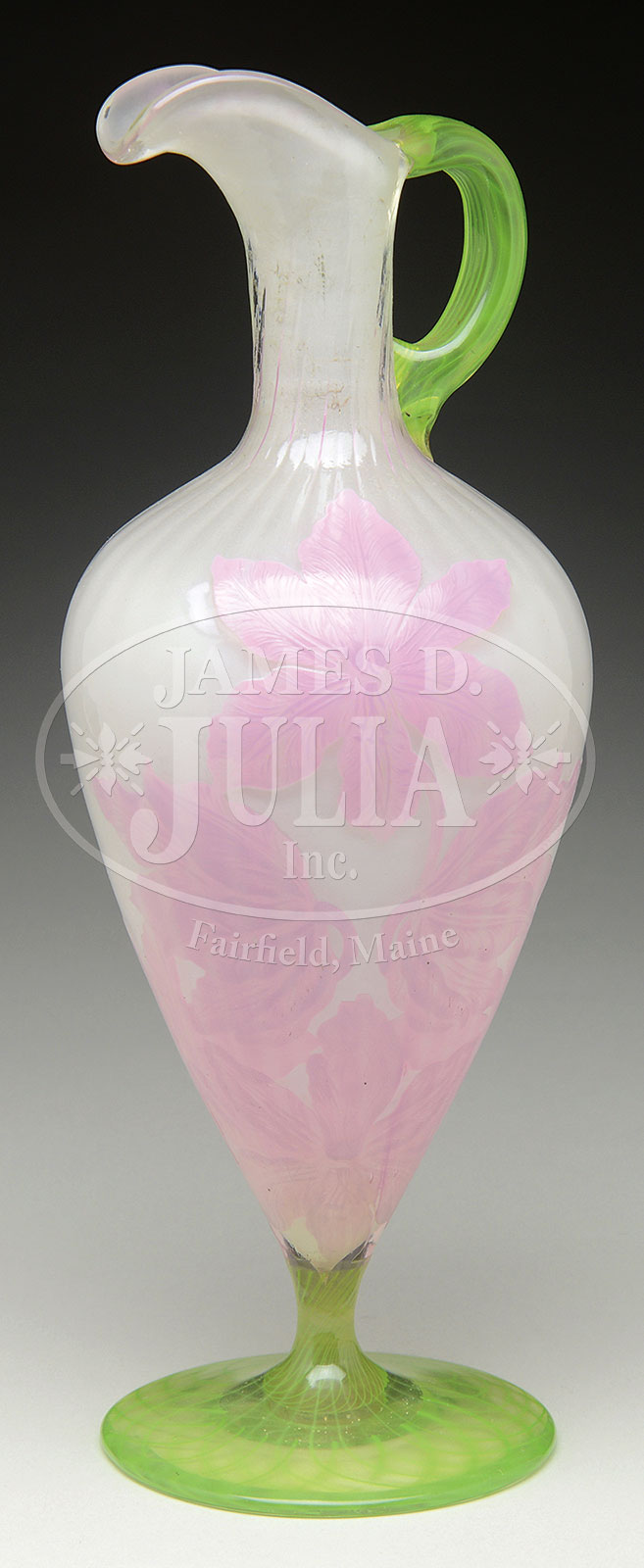 GALLE CAMEO GLASS EWER.Galle cameo glass ewer has pink cameo flowers against a clear glass background with white opalescent casing to interior. The ewer rests on a green glass pedestal base with ribbon design. The ewer is finished with an applied green glass handle. Signed on the backside with etched signature “Galle”. SIZE: 13″ t. PROVENANCE: Rudd Collection, Chicago, IL. CONDITION: Very good to excellent. 51894-18 (7,000-10,000) – Lot 1527