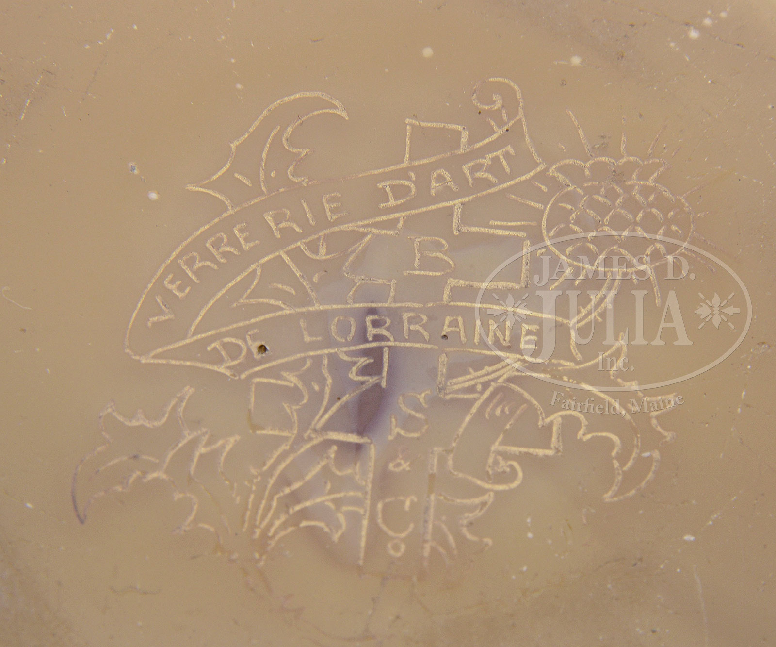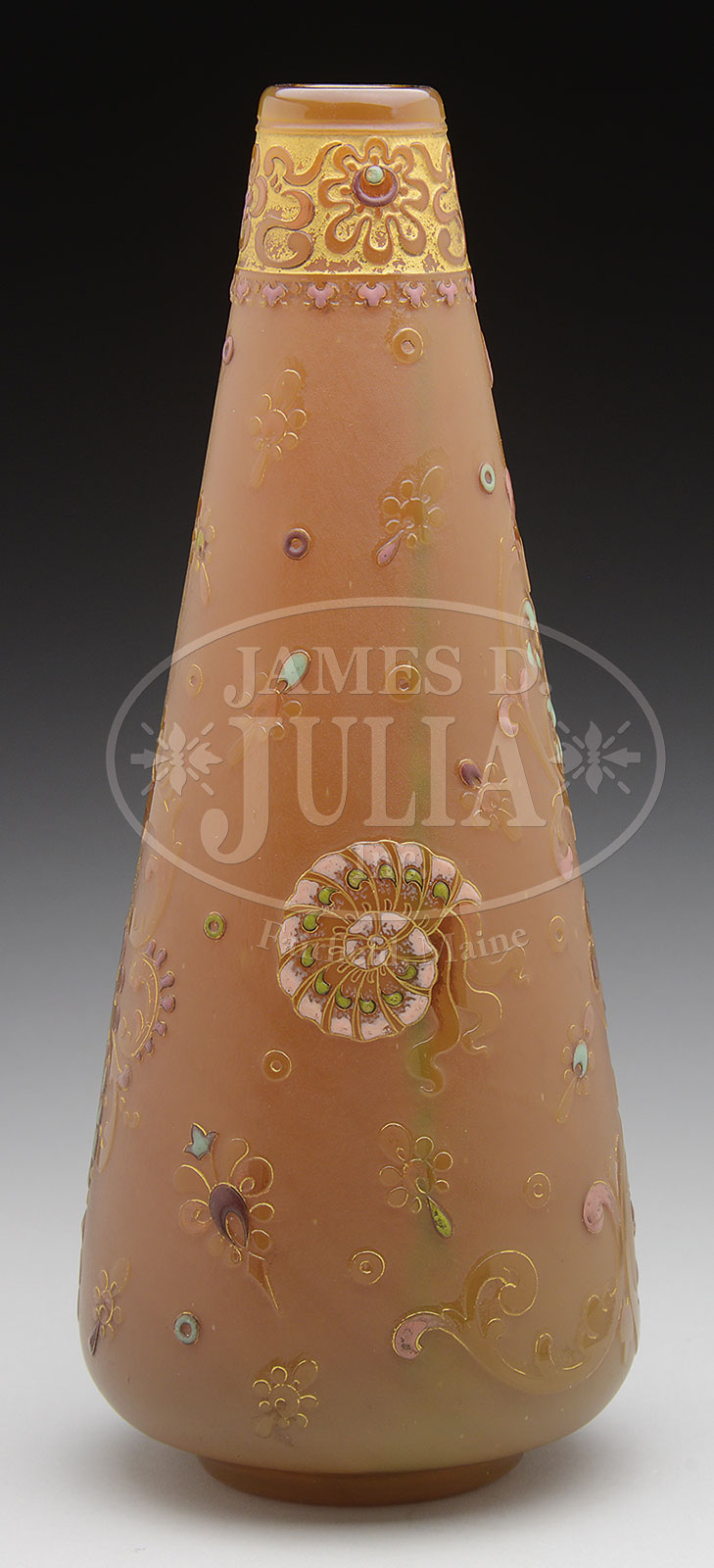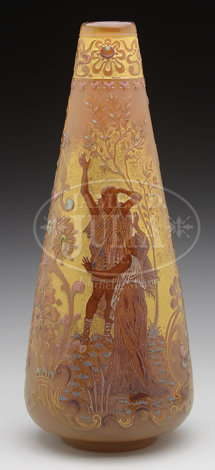 BURGUN & SCHVERER MYTHOLOGICAL CAMEO VASE.Burgun and Schverer vase is decorated with classical man and woman surrounded by trees and flowers against a gilded background. The back of the vase is decorated with light cameo shells and stylized flowers with heavy enameled detailing, all against a caramel colored ground. The vase is finished with a cameo, enamel and gilded band around the neck. Signed on the underside with gold thistle mark “Verrerie D’Art de Lorraine BS & Co”. SIZE: 12″ t. PROVENANCE: Rudd Collection, Chicago IL. CONDITION: Very good with minor wear to gilding. 51894-7 (6,000-9,000) – Lot 1528