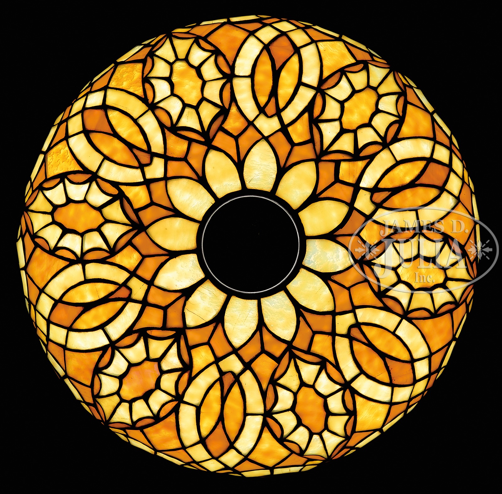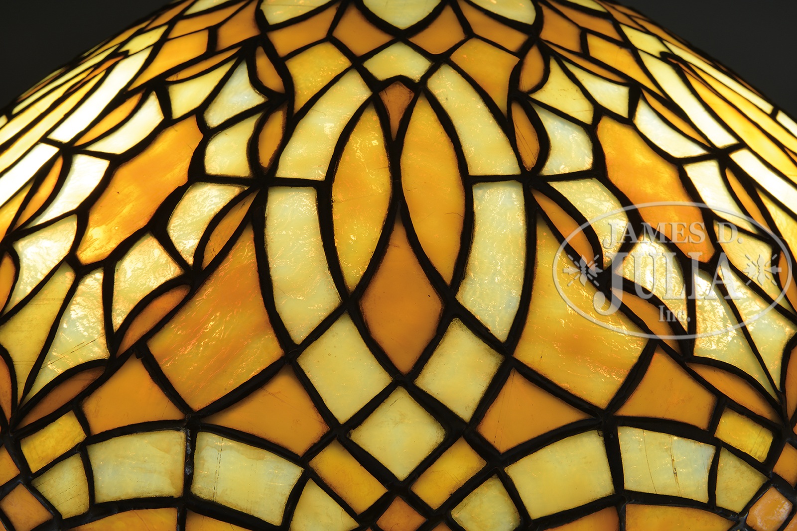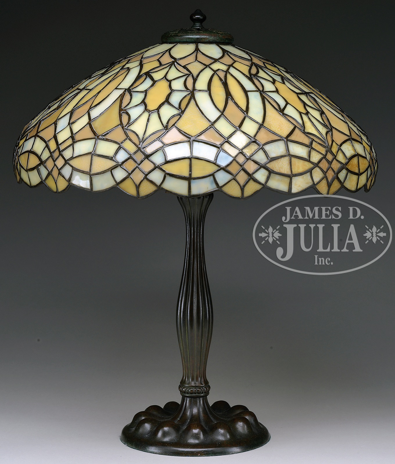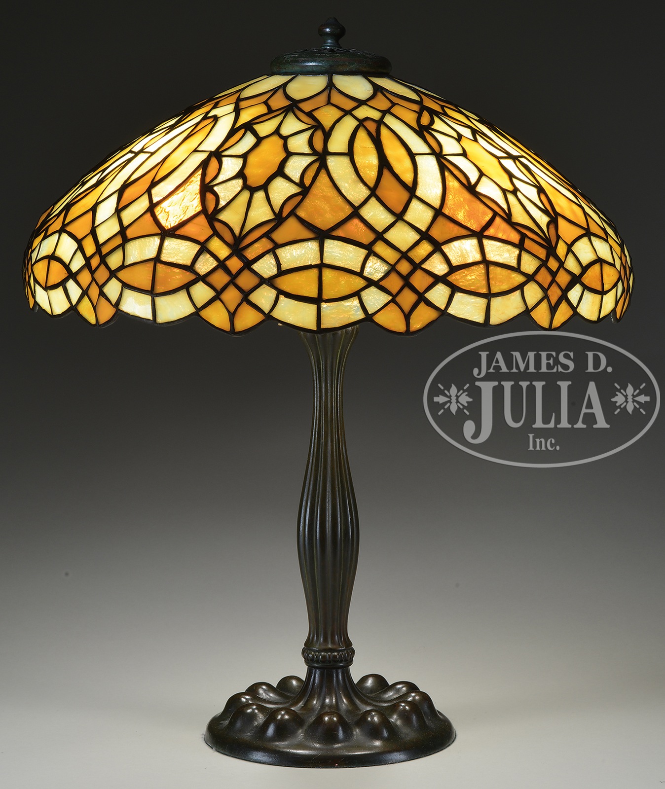 DUFFNER & KIMBERLY LEADED GLASS TABLE LAMP.Duffner & Kimberly table lamp has geometric design of swirling lines and stylistic stars all done in yellow and amber granite glass against a butterscotch background. Unsigned. Shade rests on original Duffner & Kimberly base with raised ribbing on foot and vertically ribbed stem supporting a three light cluster. Base is topped with a Duffner & Kimberly fleur de lis heat cap. Base is finished in a dark brown patina. Unsigned. Shade is photographed in the book Mosaic Shades Vol. II by Paul Crist, pg. 202. SIZE: Shade 19″ dia. Lamp 23″ t. CONDITION: Shade is very good to excellent with very few, if any, tight hairlines. Base is very good to excellent. Heat cap has different patina that shows wear. Rewired with appropriate cloth cord. 44208-2 (3,250-3,750) – Lot 1530