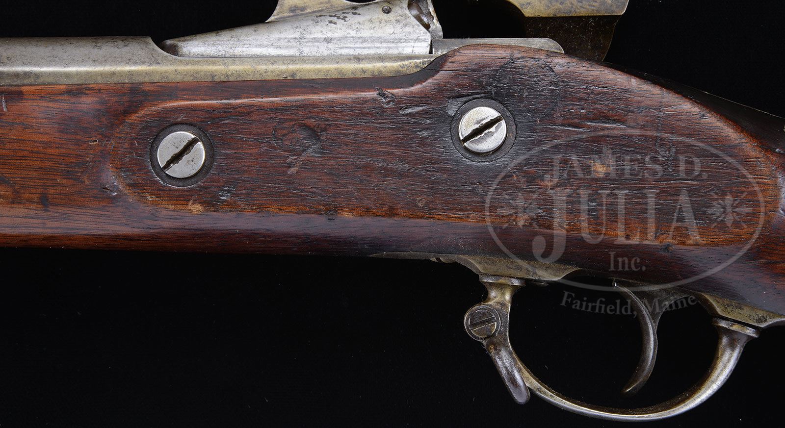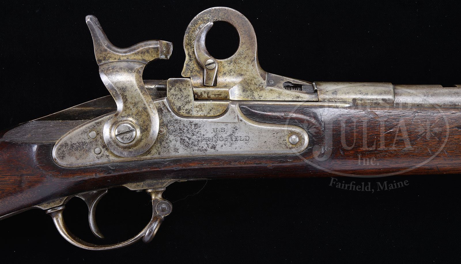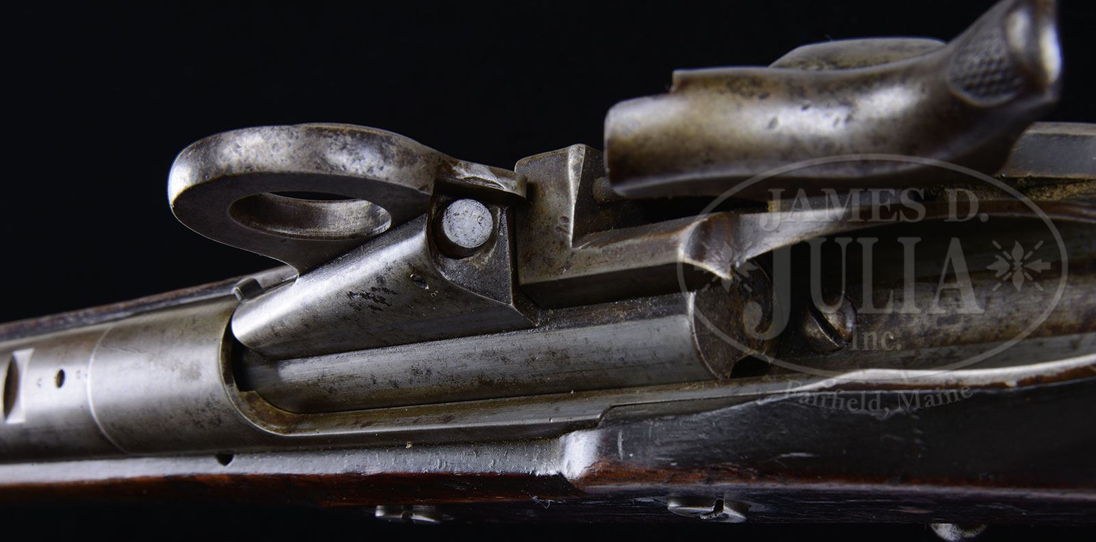RARE PROTOTYPE OR EXPERIMENTAL CONVERSION TRIALS RIFLE.SN 49768. Cal. 50-70. Probably a Trials rifle of unknown origin that has 32″ rifled bbl, square base front sight/bayonet lug, rear sight is missing. Bbl is from an Allin conversion or Model 1868 or 1870 Trapdoor, with SN on left side of chamber area. Mounted in a one-piece walnut stock without forend tip and has two bands, the front of which has a sling wire with corresponding sling wire on the trigger guard. Trigger guard is two pieces and it has standard musket buttplate. Lock plate appears to be from an 1842 Springfield musket from which the date is worn or simply missing. The most unusual bolt system in the receiver is a round bolt with spring-loaded claw extractor and a large flat metal plate integral with the breech block that has rounded top and a 3/4″ hole through the center. Attached to the right side of this plate is a small trigger-shaped device which retracts the lock pin on the right side of breech block when a finger is inserted through the hole. Hammer has been modified to strike the firing pin in its housing, which is probably the forerunner of the firing pin housing on the later Model 1873 Trapdoor Rifle. Left side panel has a visible oval “ESA” (Erskine S. Allin) cartouche and, what appears to be the remnants of another round cartouche or possibly a plugged hole. Top of bbl has three small inspector initials and numbers which would mostly be covered with the installation of the rear sight. Consultation with several knowledgeable dealers/collectors disclosed no previous knowledge of this conversion. CONDITION: Very good to fine. All the metal retains a mottled gray patina showing moderate to heavy use. Stock is missing a large chip back of lockplate; otherwise, wood is sound and retains a hand-worn patina with usual nicks, scratches, and dings. Mechanics are fine. Bright shiny bore. 4-54064 JR57 (4,000-6,000) – Lot 1531