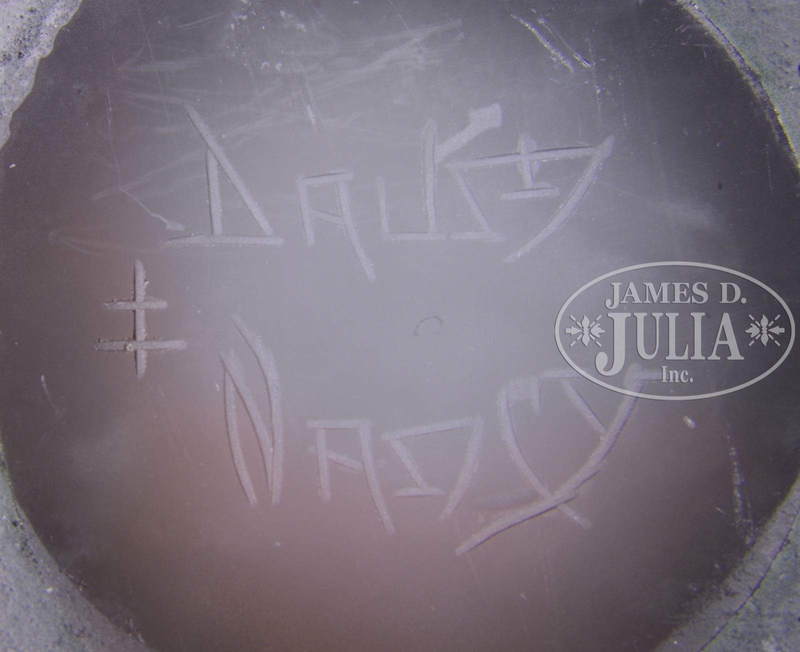 DAUM NANCY MOLD BLOWN VASE.Large Daum Nancy mold blown vase has mottled green and dark brown trees, branches and leaves surrounding the vase. The mold blown decoration is set against a fiery sky of mottled orange and yellow. Foliage at the bottom of the vase in between the trees is wheel-carved. Signed in the polished pontil with engraved “Daum Nancy” with cross of Lorraine. SIZE: 17-1/4″ t. CONDITION: Very good to excellent with several tiny open bubbles around the foot from the making. 42390-7 (8,000-10,000) – Lot 1533