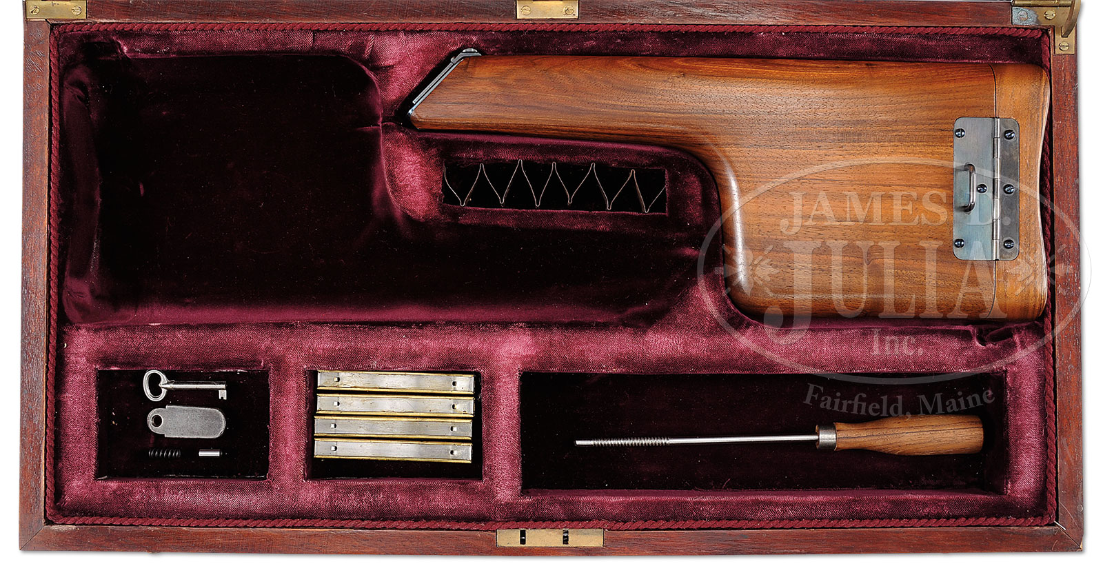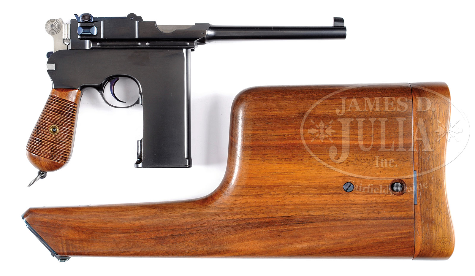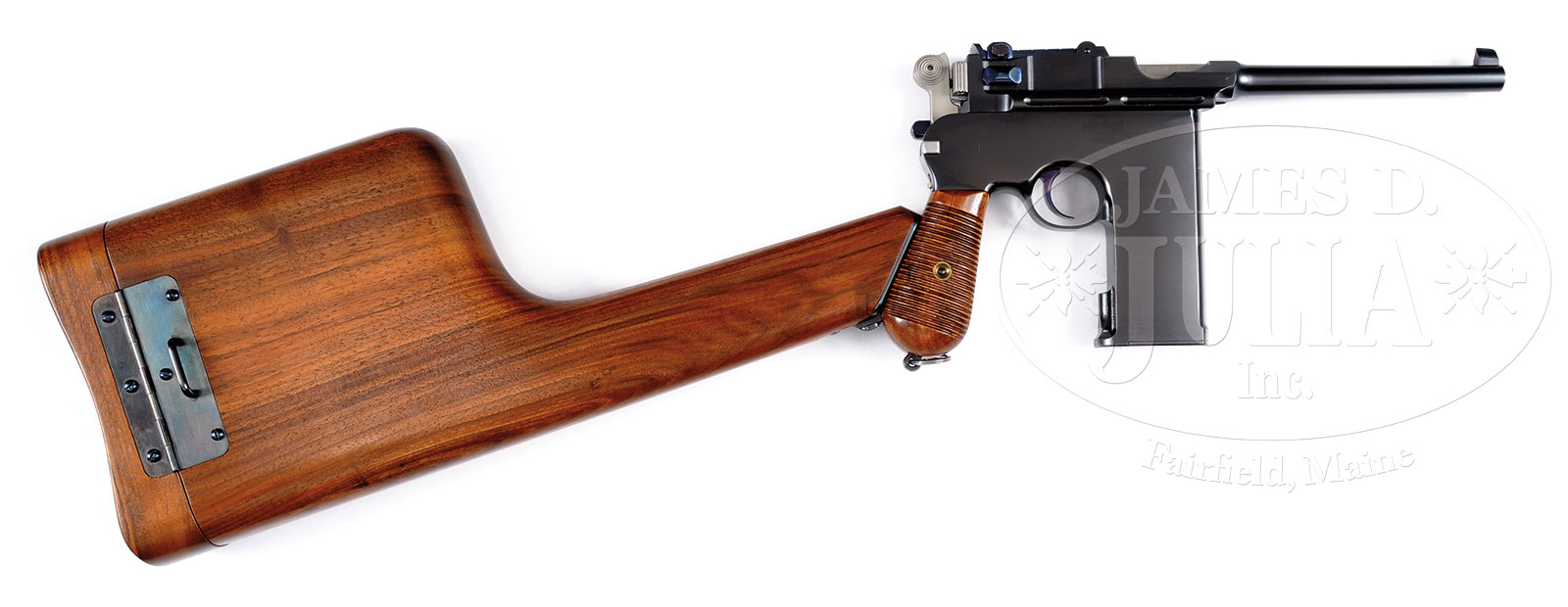 MAUSER C96 20 SHOT FLATSIDE WITH MATCHING STOCK IN PRESENTATION CASE.SN 43. Cal. 7.63 mm. Mauser made 100 Flatside 20 shot Conehammers in a separate serial range numbered 1-100 whose features depended upon their production sequence. This mid-production pistol has a 5.5″ bbl with fixed front sight and a pinned 1-10 rear sight. Early bolt has a long extractor and an independently secured firing pin. Usual chamber marking with Crown/Crown U on left side of bbl extension. Antler proof on the right side. Later frame fitted with thin trigger, has the SN on the back strap just below the locking lever. All external numbers are matching with extended disassembly showing that the gun is matching throughout including the firing pin, 20-shot stock with matching number on upper arm of unique attaching iron having a broadly serrated plunger, on inner surface of wooden body near release latch and on lid under tension spring. Presented in a beautifully aged walnut case whose upper lid has a blank brass plaque and inletted for four burl panel inlays within a highlighted border. Lid lined in faded silk. Purple velvet base bordered with cord and compartmentalized for a pair of stocked 20-shot pistols, spare follower spring and 3 separate compartments that now contain a spare floorplate numbered “1674”, 4 stripper clips, a cleaning rod and a key. PROVENANCE: The Friedrich-Wilhelm Dauphin Collection – Germany. CONDITION: Beautifully, but heavily reworked pistol now presents as new with virtually no discernible wear. All surfaces have been professionally freshened with flat planes and sharp edges. The markings on both sides of the bbl extension have been reapplied, as has the SN on the backstrap. The fire blue parts have been carefully reworked in the same manner, most with reapplied numerals, where they too now present as new. Hammer and sub-frame have been freshened, as have all attached small parts, including the locking lever that has been restrawed. The follower spring and both grips are replacements that have been numbered to match in a correct manner. Reproduction stock is of the highest quality and appears equally new with the bright fire blue of the lug and hinge showing no perceptible wear. Presentation case has been suitably aged for an item made over a century ago with chemical fading of the lid and mechanical distressing of the base. Spare floorplate is in good condition, now appearing as a grayed part with etching. Reproduction cleaning rod is as new. An extraordinary and impressive ensemble that can be purchased for just a fraction of the cost of an all original rig. 49828-4 LMA (9,500-16,500) – Lot 1533