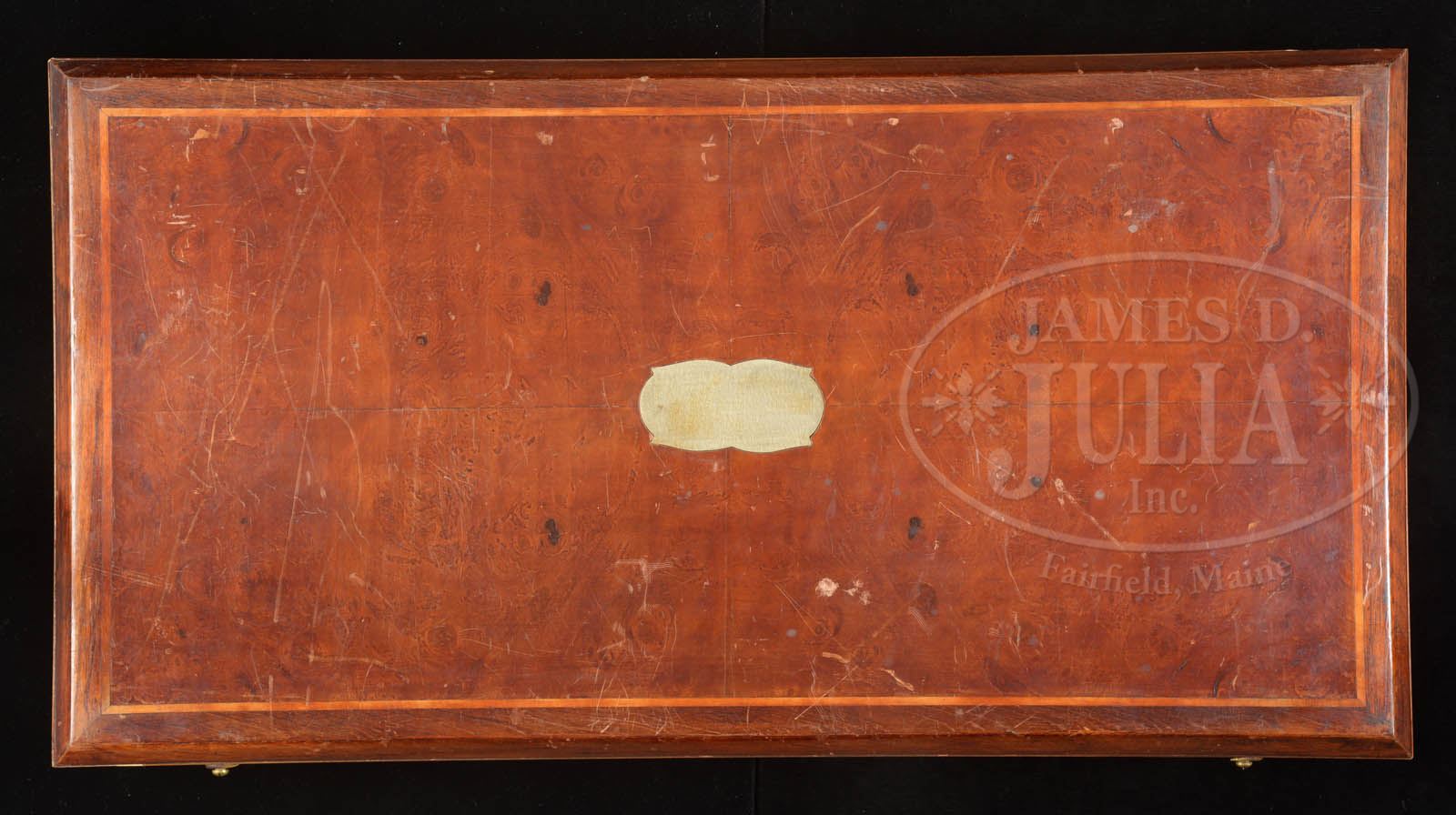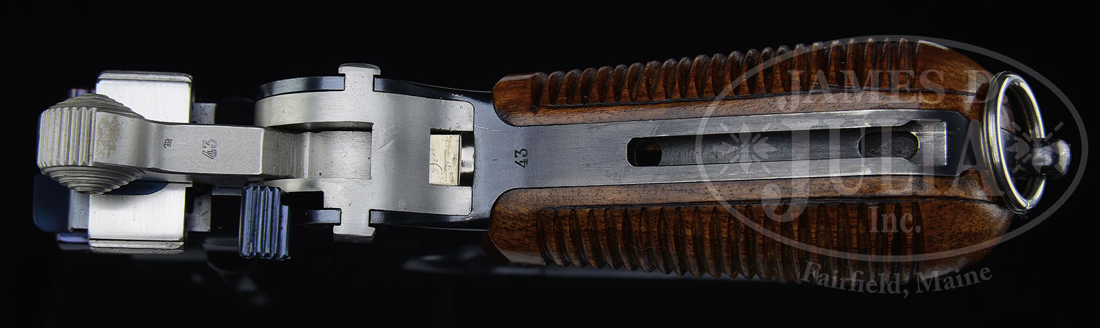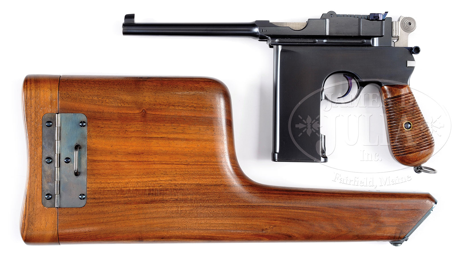 MAUSER C96 20 SHOT FLATSIDE WITH MATCHING STOCK IN PRESENTATION CASE.SN 43. Cal. 7.63 mm. Mauser made 100 Flatside 20 shot Conehammers in a separate serial range numbered 1-100 whose features depended upon their production sequence. This mid-production pistol has a 5.5″ bbl with fixed front sight and a pinned 1-10 rear sight. Early bolt has a long extractor and an independently secured firing pin. Usual chamber marking with Crown/Crown U on left side of bbl extension. Antler proof on the right side. Later frame fitted with thin trigger, has the SN on the back strap just below the locking lever. All external numbers are matching with extended disassembly showing that the gun is matching throughout including the firing pin, 20-shot stock with matching number on upper arm of unique attaching iron having a broadly serrated plunger, on inner surface of wooden body near release latch and on lid under tension spring. Presented in a beautifully aged walnut case whose upper lid has a blank brass plaque and inletted for four burl panel inlays within a highlighted border. Lid lined in faded silk. Purple velvet base bordered with cord and compartmentalized for a pair of stocked 20-shot pistols, spare follower spring and 3 separate compartments that now contain a spare floorplate numbered “1674”, 4 stripper clips, a cleaning rod and a key. PROVENANCE: The Friedrich-Wilhelm Dauphin Collection – Germany. CONDITION: Beautifully, but heavily reworked pistol now presents as new with virtually no discernible wear. All surfaces have been professionally freshened with flat planes and sharp edges. The markings on both sides of the bbl extension have been reapplied, as has the SN on the backstrap. The fire blue parts have been carefully reworked in the same manner, most with reapplied numerals, where they too now present as new. Hammer and sub-frame have been freshened, as have all attached small parts, including the locking lever that has been restrawed. The follower spring and both grips are replacements that have been numbered to match in a correct manner. Reproduction stock is of the highest quality and appears equally new with the bright fire blue of the lug and hinge showing no perceptible wear. Presentation case has been suitably aged for an item made over a century ago with chemical fading of the lid and mechanical distressing of the base. Spare floorplate is in good condition, now appearing as a grayed part with etching. Reproduction cleaning rod is as new. An extraordinary and impressive ensemble that can be purchased for just a fraction of the cost of an all original rig. 49828-4 LMA (9,500-16,500) – Lot 1533