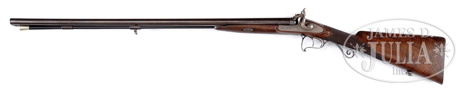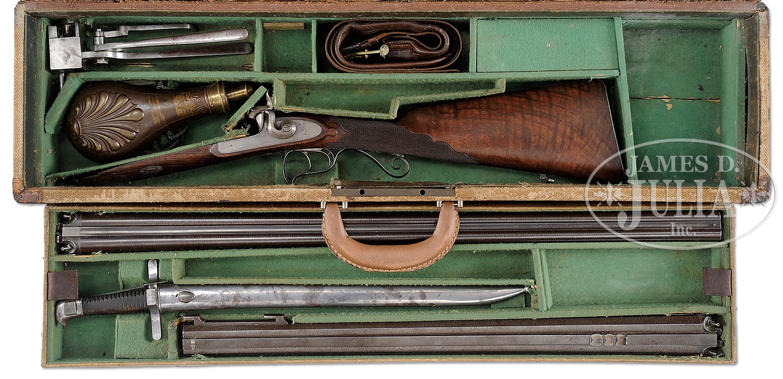 UNMARKED, BUT HIGH QUALITY, BELGIAN PERCUSSION DOUBLE RIFLE WITH BAYONET AND EXTRA SET OF SHOTGUN BARRELS IN TWO-TIERED ORIGINAL CASE WITH FINE ACCESSORIES.SN 146. Cal. .600 and 14 ga. (Rifle bbls are .602 groove diameter, 5 narrow grooves) (14 ga Shotgun is .690 bore diameter) 24-1/2″ Tapered octagon rifle bbls are fitted with slightly raised full length rib mounted with one standing, three folding leaf rear sight, and has bayonet lug on side of right bbl. Steel mounted bayonet with ribbed horn handle is in steel scabbard. Bbl mounts a steel ramrod with brass tip. 30″ Fine twist shotgun bbls hold ebony ramrod with German silver tip. Plain iron locks with serpentine hammer are case hardened and line engraved. Trigger plate finial is well shaped, matching thimble. Scrolled trigger guard is blued. Nicely figured European walnut stock has steel buttplate with trap and fancy checkering at grip. Weight (Rifle): 7 lbs 2 oz. Two tiered canvas case with leather and iron trim is lined in green cloth, and contains orig steel mold with hollow base pin and pivoting pouring funnel, a shell embossed powder flask, and a leather shot snake. CONDITION: Excellent. Bbls retain over 90% of their orig finish. There is lots of orig case hardening color on locks, and plenty of temper blue on trigger guard and buttplate. Wood is very fine with some marks. There is a 2-1/2″ crack on left portion of forend. Bores are excellent. Case has considerable scuffing and deterioration. Interior cloth is good with many rubs and scuffs. Accessories are fine. 49706-1 MGM201 (3,500-5,000) – Lot 1536