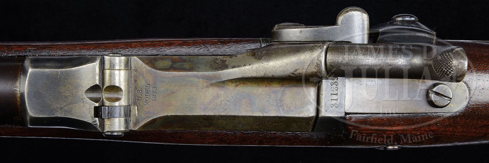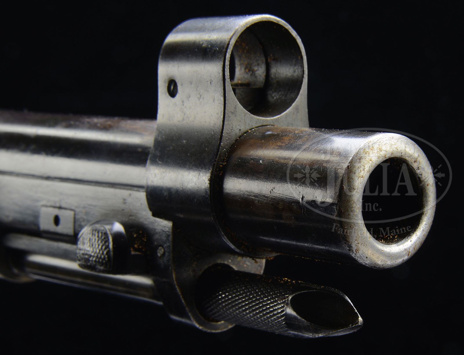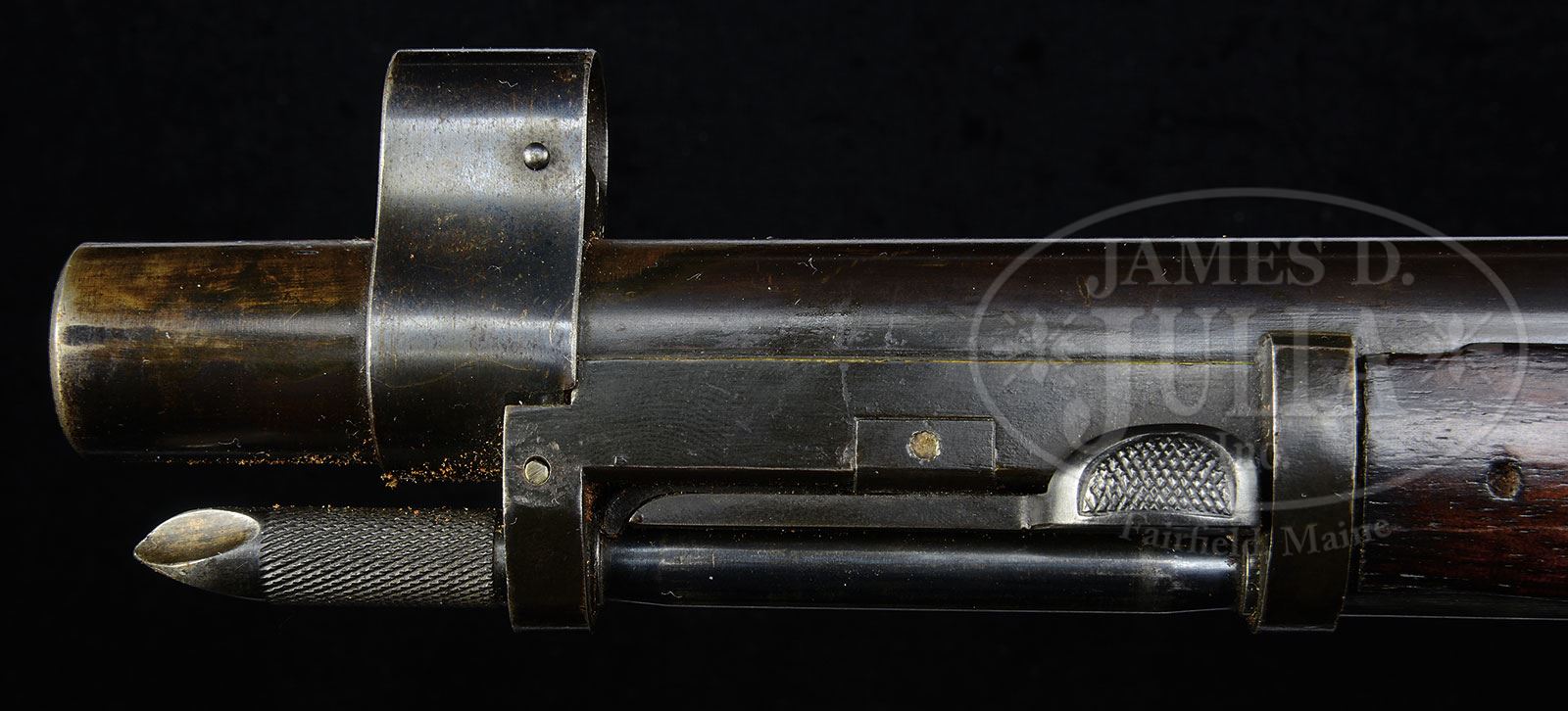 VERY RARE MODEL 1884 EXPERIMENTAL RAMROD BAYONET TRAPDOOR RIFLE.SN 311239. Cal. 45-70. Usual configuration with 32-5/8″ rnd bbl, permanently attached front sight cover and Buffington rear sight with “R” on the blade. Breech block has standard “1873” markings. Lockplate & hammer retain dark oil hardened finish and have usual Springfield markings with an eagle. Mounted in a 1-pc uncheckered walnut stock with two bands, the front with both stacking & sling loop with corresponding sling loop on trigger guard. Left side of wrist has a legible “SWP / 1885” cartouche. Usual musket buttplate with trap containing broken shell extractor and multi-tool. Equipped with rnd, dimpled-end rod bayonet with experimental flat latch. According to Flayderman’s Guide to Antique American Firearms there were 1,000 of these rifles produced in 1884. These rifles were for test trials and according to referenced publication, widely distributed with few surviving. CONDITION: Fine to very fine. Bbl retains about 95-97% strong orig blue with a couple of small scratches & dings and wear around the muzzle; breech block & top tang retain strong, moderately faded case colors; lockplate & hammer are a mottled blue/black; trigger guard & buttplate retain strong blue, slightly dulled on bottom tang and showing wear on the heel. Wood is sound with handling & use nicks, dings & scratches and shows a fine hand worn patina. Bayonet latch retains strong dark blue. Mechanics are fine, bright shiny bore. 4-54062 JR52 (10,000-15,000) – Lot 1537