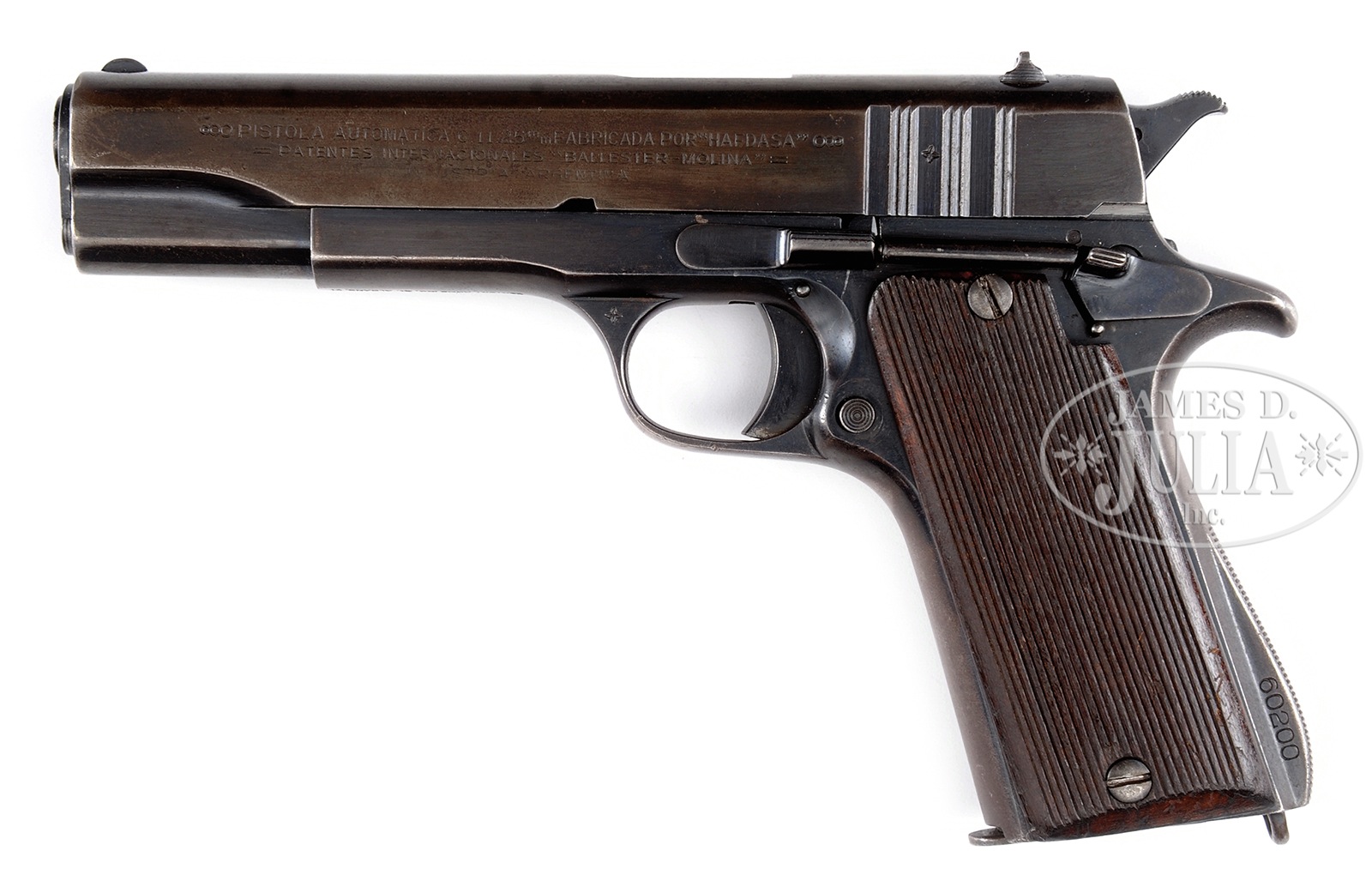 *FINE ARGENTINE MODEL 1937 BALLESTER MOLINA POLICIA FEDERAL.SN 60200. Cal. 11.25mm/45 ACP. Federal police contract Argentine Model 1937 Ballester Molina. Manufactured by Hafdasa in Argentina for military and police use. These are a modified Colt 1911 design. Left side of slide has traditional 2-line address of Ballester Molina. Right side of slide has traditional Argentine crest and is marked “Policia Federal”. 2-pc walnut grips with full length striations. Serial numbered at back of receiver “60200”. PROVENANCE: Gerard Ruth Collection, ex Alex Chauffe SR. CONDITION: Very good overall, with much finish remaining. Slide finish has turned somewhat plum with good sharp markings. Front and back strap have both turned somewhat dove grey. Grips are very good with minor scratches and darkening but applicable to age. Small importation marking on bottom of frame “CENTURY ARMS INC., ST. ALBANS, VT”. Magazine is not numbered to gun. 51036-15 TDW (1,500-2,500) C&R – Lot 1537