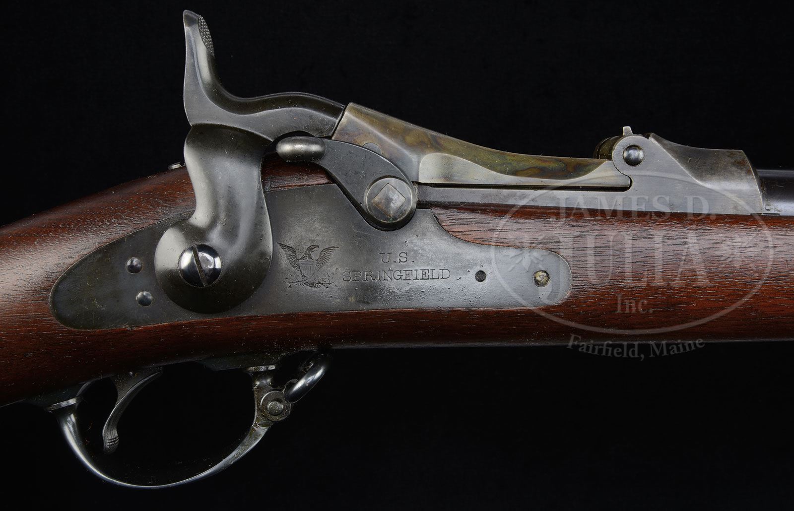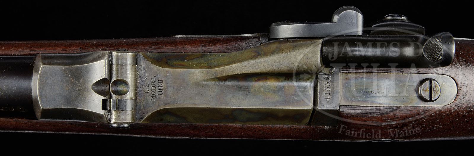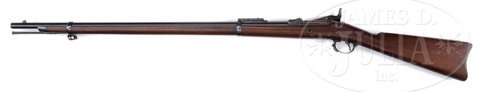 EXTREMELY RARE SPRINGFIELD MODEL 1888 EXPERIMENTAL POSITIVE CAM TRAPDOOR RIFLE.SN 415527. Cal. 45-70. Usual configuration with 32-5/8″ rnd bbl, square base front sight/bayonet lug and Buffington rear sight with an “R” on the standing leaf. Breech block is dated “1888” and lockplate is marked “U.S. / SPRINGFIELD” with a small eagle. Mounted in an uncheckered 1-pc walnut stock with two bands and buttonhead ramrod. Upper band has both stacking & sling swivels with a corresponding sling wire on the trigger bow. Buttplate is blued steel musket plate with “US” on the tang. Left side of wrist has a crisp rectangular “SWP / 1888” cartouche. There were only 100 of these rifles produced at Springfield in 1888. Examples of this rare rifle are very seldom encountered and have usually undergone field testing showing wear and occasionally some abuse. CONDITION: Extremely fine plus, probably unfired. Overall retains 99%+ crisp orig blue on the bbl, bands, trigger guard & buttplate; breech block & top tang retain strong, bright case colors; lockplate & hammer are a dark oil hardened finish. Wood is equally new with a few minor storage & handling nicks and retains virtually all of its orig oil finish. Mechanics are crisp, brilliant shiny bore. 4-54063 JR51 (12,500-17,500) – Lot 1538