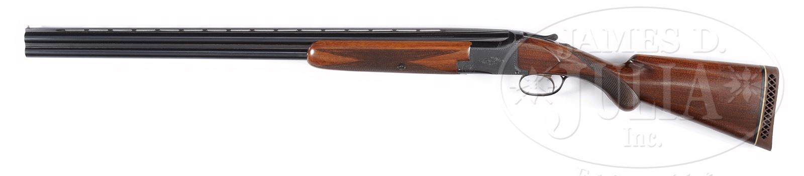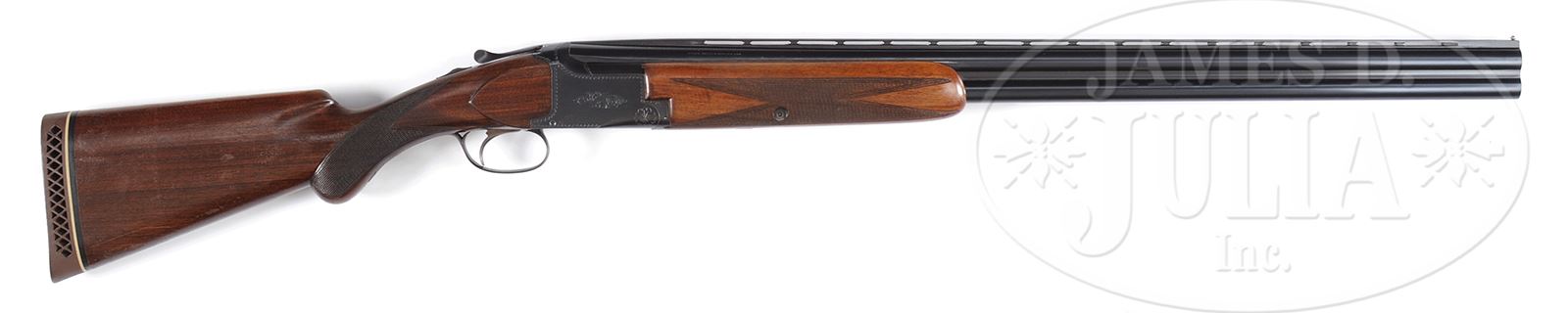 *EARLY BROWNING GRADE “1” SUPERPOSED.SN 16589. Cal. 12 Ga. 28″ ventilated rib bbl. 2-3/4″ chambers. Single trigger, ejectors and non-automatic safety. Bbls with steel front bead. Standard early Grade “1” engraving. 12-3/4″ LOP over “White Line” Pachmayr pad. Stock is RKLT configuration. Standard 2-pt checkering pattern. Bottom of frame marked “BROWNING TRADE MARK”. Weight 7 lbs. 2 oz. Bore diameter: Both .726. Choke: T -.022, B -.015. PROVENANCE: Rod Fuller Estate Collection. CONDITION: Very good. Bbl retains 92-95% orig finish with hints of freckling. Bore is excellent. Frame retains about 85% orig blue with light freckling. Trigger guard bow retains most of its blue, toned at tang. Stock finish very good with light crazing and cracquelure. Mechanics excellent. Ejectors in time. 49291-27 JSL34 (750-1,250) – Lot 1539