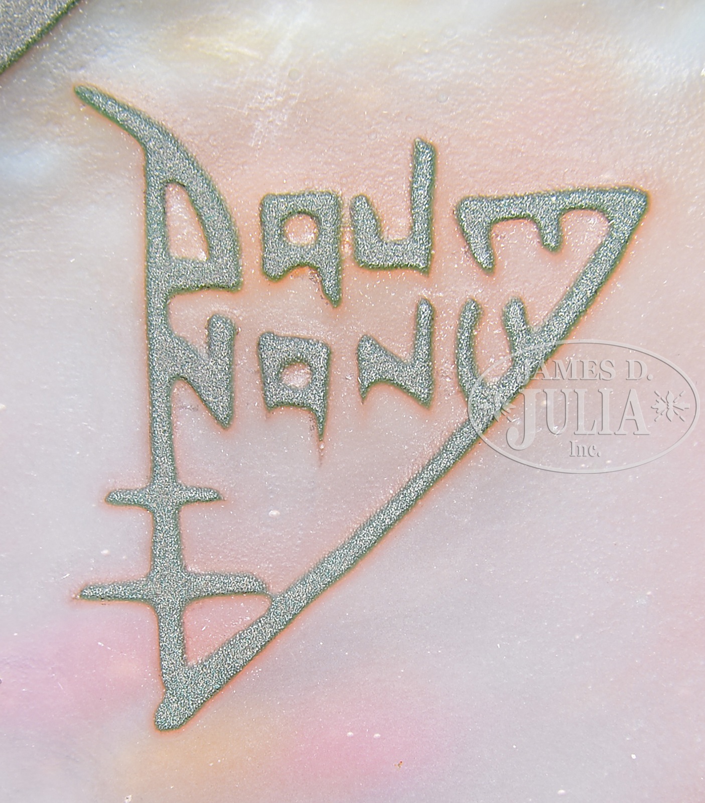 DAUM CAMEO GLASS TABLE LAMP.Daum table lamp has cameo decoration of large green leaves encircling the shade and base with orange colored cameo oranges or peaches scattered among the leaves all against a mottled pink shading to orange background. Lamp base is complete with hammered metal collar and four arm spider. Shade is signed on the side in cameo “Daum Nancy” with the cross of Lorraine. Base is signed near the bottom “DN”. SIZE: Shade 10-1/2″ at widest. Lamp 19-3/4″ t. CONDITION: Very good to excellent. Rewired with appropriate cloth cord. 1101-93 (7,500-9,500) – Lot 1541