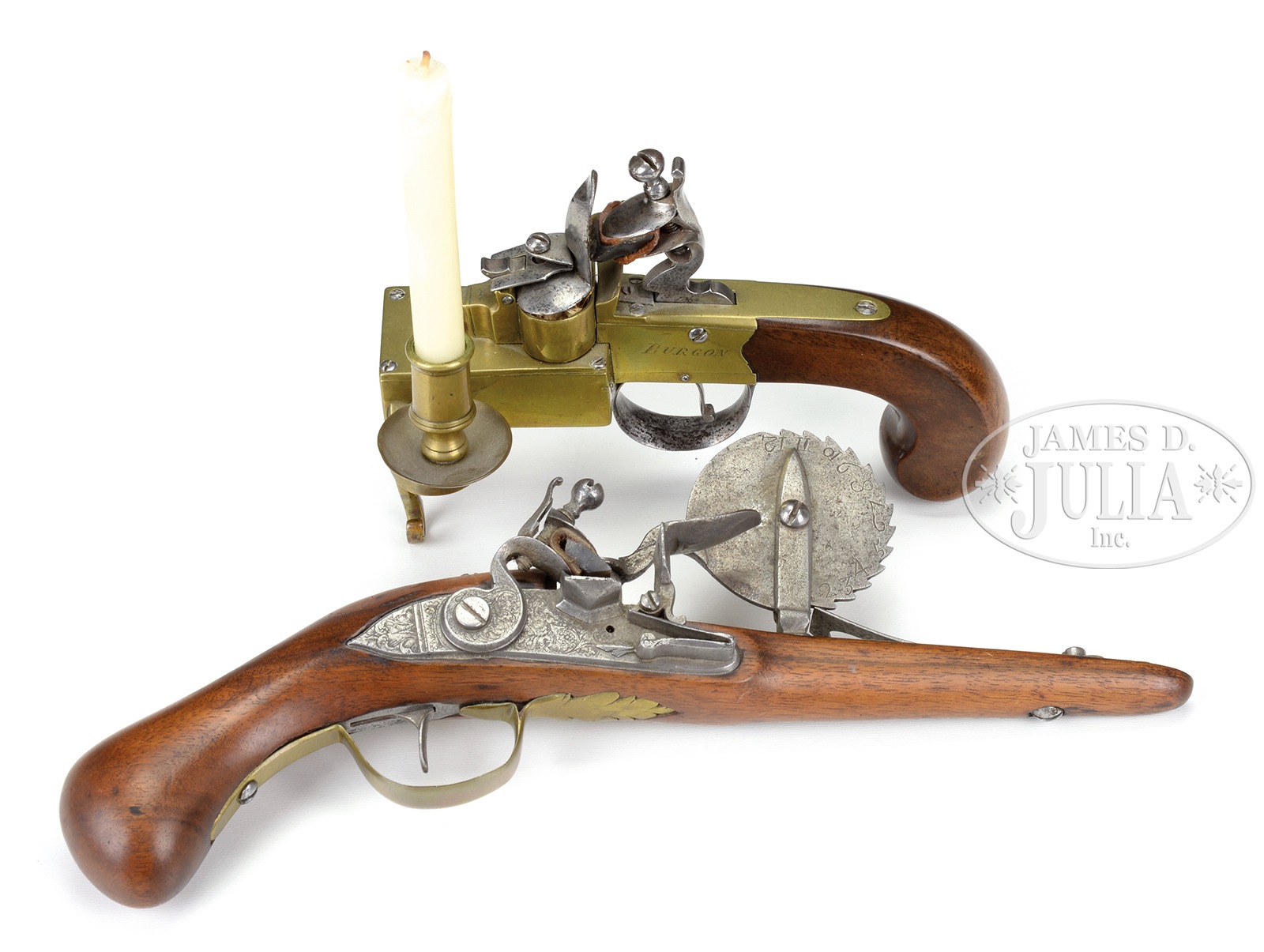 1) 18th century “BURGON, LONDON” marked brass tinder lighter with attached candlestick holder. 7″ l x 5″ t. 2) 18th century style powder tester, probably European with measuring wheel numbered 1-12 on each ratchet. Engraved lock shows figure blowing a horn, brass trigger guard and lock escutcheon plate. CONDITION: 1) Very good to fine overall, complete and functional. 2) Very good overall, stock re-finished, metal gray with pitting, otherwise appears complete and original. 50143-4 JS (2,000-3,000) – Lot 1541