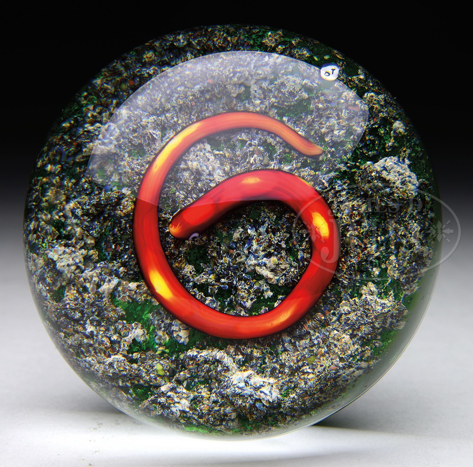 DELMO TARSITANO SNAKE PAPERWEIGHT.Delmo Tarsitano red overlay coiled snake paperweight with window cut body on an earth-like ground. Signed “DT” in a cane within the design. SIZE: 3-1/4″ x 2-1/4″ deep. CONDITION: Very good to excellent. 50465-7 (600-800) – Lot 1541