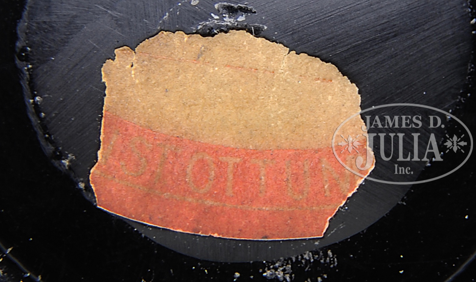 MT. WASHINGTON LAVA GLASS VASE.Mt. Washington lava glass vase has inlaid shards of pink, gray, green, blue and white against the shiny black glass body. Vase has the remnants of an original paper label. SIZE: 5-1/4″ t. CONDITION: Very good to excellent. 5-68259 (1,500-2,500) – Lot 1542