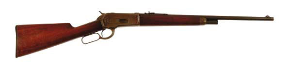 *WINCHESTER LIGHTWEIGHT MODEL 1886 LEVER ACTION RIFLE. Cal. 45-70. Standard grade rifle with 22″ tapered round bbl, pedestal mounted ivory bead hunting front sight, flat topped bbl sight, uncheckered wood with straight stock and Winchester hard rubber buttplate. SN 135817. CONDITION: Good to very good. Bbl and mag tube retain 85-90% dark original blue. Receiver, traces of original blue in sheltered areas with the balance a gray-brown patina. Wood is sound, shows much wear but no abuse, being a fine hand-worn patina. Magazine tube cap is a flat replacement. Strong bright bore that appears to have some light frosting but may clean. 4-46091 JR385 (1,250-1,750)