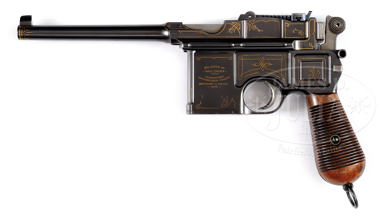 MAUSER C96 CONEHAMMER, GOLD INLAID PRESENTATION, IN CUSTOM CASE WITH ROD.SN 5409. Cal. 7.63 mm. Standard configuration mid-production Mauser Conehammer that has been exqusitely custom embellished with gold line highlighting and a presentation inscription. Usual 5.5″ bbl with fixed front sight and pinned 1-10 rear sight. Long extractor and independently secured firing pin. 3-line Mauser address on the chamber with Crown/Crown U proofing on left chamber flat and antler acceptance on right side. The top of the bbl is gold inscribed “EXMO. SR. MINISTRO LUIS M. CAMPOS”. The left side of the frame is marked as a gift, highlighted in gold, “RECUERDO de / -PAUL MAUSER- / Y DE LA / MANUFAKTURA WAFFENFABRIK MAUSER / OBERNDORF O. NECKAR / -1899-“. Full SN appears on backstrap, just under locking lever, and is repeated under the rear sight, bolt stop, firing pin retainer, and hammer. Disassembly shows a matching floorplate, follower, sub-frame and related components, locking block, bolt, firing pin and each of the walnut serrated grips. Major parts rust blued with fire blued small parts, grayed hammer and bright polished trigger. Lanyard ring present. Presented in a oak case having a 1.5” medallion on lid with initials “LMC”. Lid, that has broken free of hinges, is lined in cream silk imprinted with gold Waffenfabrik Mauser address. Base lined in purple velvet, compartmentalized for pistol, 2 stripper clips (not present), reproduction cleaning rod (present), and box of ammo (oiler in this space). Lid secured with two rotating brass clasps and a central keyed lock. PROVENANCE: The Friedrich-Wilhelm Dauphin Collection – Germany. CONDITION: Beautifully embellished pistol retains at least 98% of reapplied rust blue with just a few minuscule dings under the bbl, trace wear at the leading edge of floorplate that has a small scratch and minor imperfections on the front and back strap. No discernible losses of the gold highlighting, whose pattern reflects the style used by Mauser in the early 20th Century. Fire blued parts retain 80-90% orig finish. Comparable condition grips with orig varnish, showing superficial handling dings. Dull bore with shallow rifling and oxidation. Perfect manual mechanics. Case is in good condition with lid separation previously noted. Artificial staining and imperfections of lid and base liner, particularly where in contact with pistol and accessories. Near excellent cleaning rod and VG oiler. A beautiful custom embellished ensemble. 49828-69 LMA (4,500-9,000) – Lot 1544