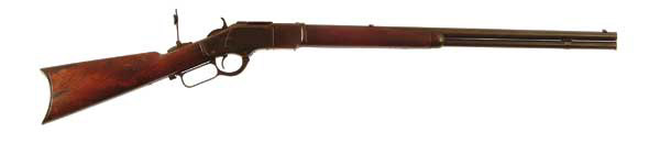 WINCHESTER MODEL 1873 LEVER ACTION RIFLE. Cal. 22 Short. Standard grade rifle with 24″ round bbl, full magazine, standard front sight, slot blank in rear dovetail with a fine early thick base short range tang sight, not designed for this rifle. Uncheckered wood with straight stock and crescent steel buttplate. SN 218237. CONDITION: Good. Bbl and mag tube retain most of an old re-blue with scattered fine pitting. Bbl address is thin but legible. Receiver has traces of original finish in sheltered areas around the sideplates but is mostly a dark brown patina. Forearm is cracked down the bottom with a chip out of the left bbl channel and the wood has most of a refinish. Poor, dark bore. 4-46152 JR384 (750-1,250)