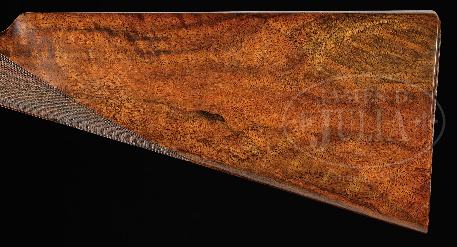 SN 1513. Cal. 12 ga. 27-3/4″ bbls, hand filed tapered concave rib with sgl brass sighting bead, IMP CYL/IMP MOD chokes, 2-3/4″ chambers, dbl triggers and ejectors. Top of right bbl is marked “BROWNING SA MADE IN BELGIUM” and left bbl “CAL 12 GA SHELLS 2-3/4″”. Sideplated receiver is engraved with pheasants on left plate, ducks on right, woodcock on bottom with balance a bold foliate scroll with shaded background. Fences are carved oak leaves with a pierced top lever. Mounted with nicely figured walnut, fluted drop point, checkered straight grip, checkered butt, checkered splinter forend with push tip release. Bore diameter: right – .724, left – .725. Bore restrictions: right – .010, left – .020. Wall thickness: right – .037, left – .038. Drop at heel: 2-1/2″, drop at comb: 1-1/2″. Weight: 6 lbs. 6 oz. LOP 14-3/4″. Accompanying gun is a Browning maroon custom shop luggage case and a certificate of identification dated 3/3/1997. PROVENANCE: The Estate of B.E. “Andy” Anderson. CONDITION: Extremely fine as gun appears new and test fired only. Bbls retain 99% orig blue with just a couple faint handling marks. Receiver is crisp, clean and bright. Stock is sound with sharp checkering, a couple tiny small handling marks and retain orig oil finish. Forend is sound with sharp checkering, a couple tiny handling marks and retains orig oil finish. Mechanics are crisp with non-automatic safety, strong ejectors, bright shiny bores as gun appears new and test fired only. Case is in equally new condition. 49531-14 BDT (4,000-6,000) – Lot 1546