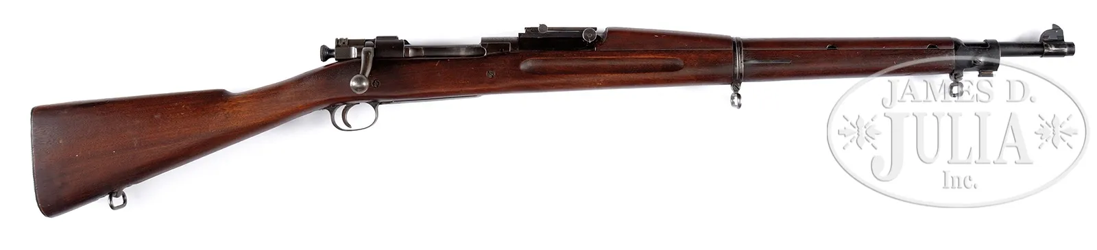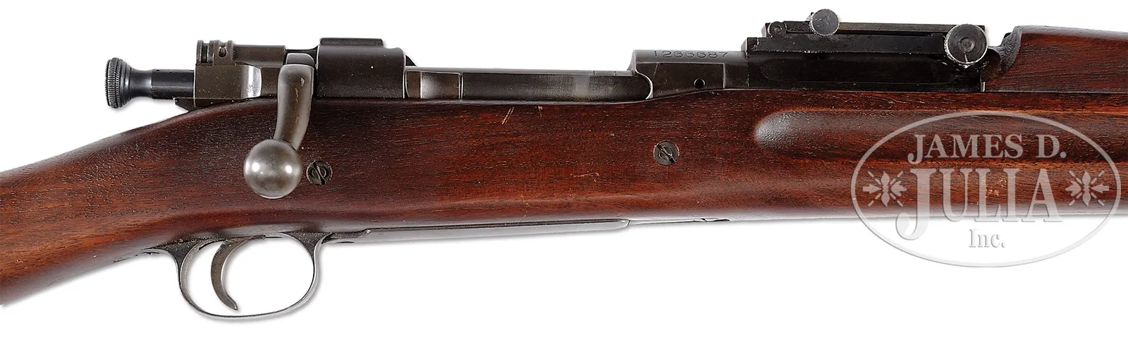 SN 1266687. Cal. 30-06. 24″ bbl dated 7-25. Dark phosphate finished bbl action and components. Two pin finger groove straight gripped walnut stock. Type-3 hand guard with flat sight adjustment knobs. Strong “DAL” cartouche in stock with heavily checkered match buttplate. Strong star gauge proof on muzzle and polished bright rear sight elevator. CONDITION: Exceptional overall with most all orig finish remaining with only moderate loss at front sight from sight cover use, slight edge wear on buttplate and high points of swivels and bayonet lug. Rifle has a very pleasant coating of dried oil and is in wonderfully uncleaned preservation. 50274-2 TDW (1,500-2,500) C&R – Lot 1546