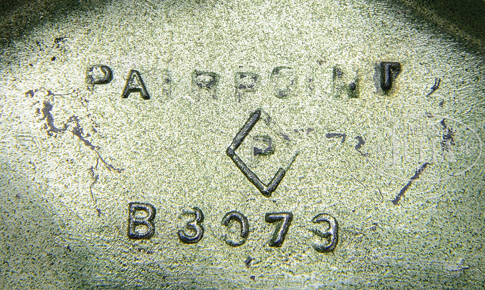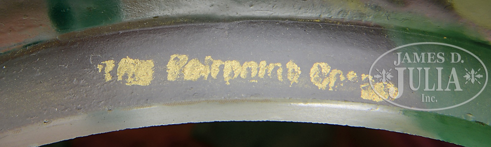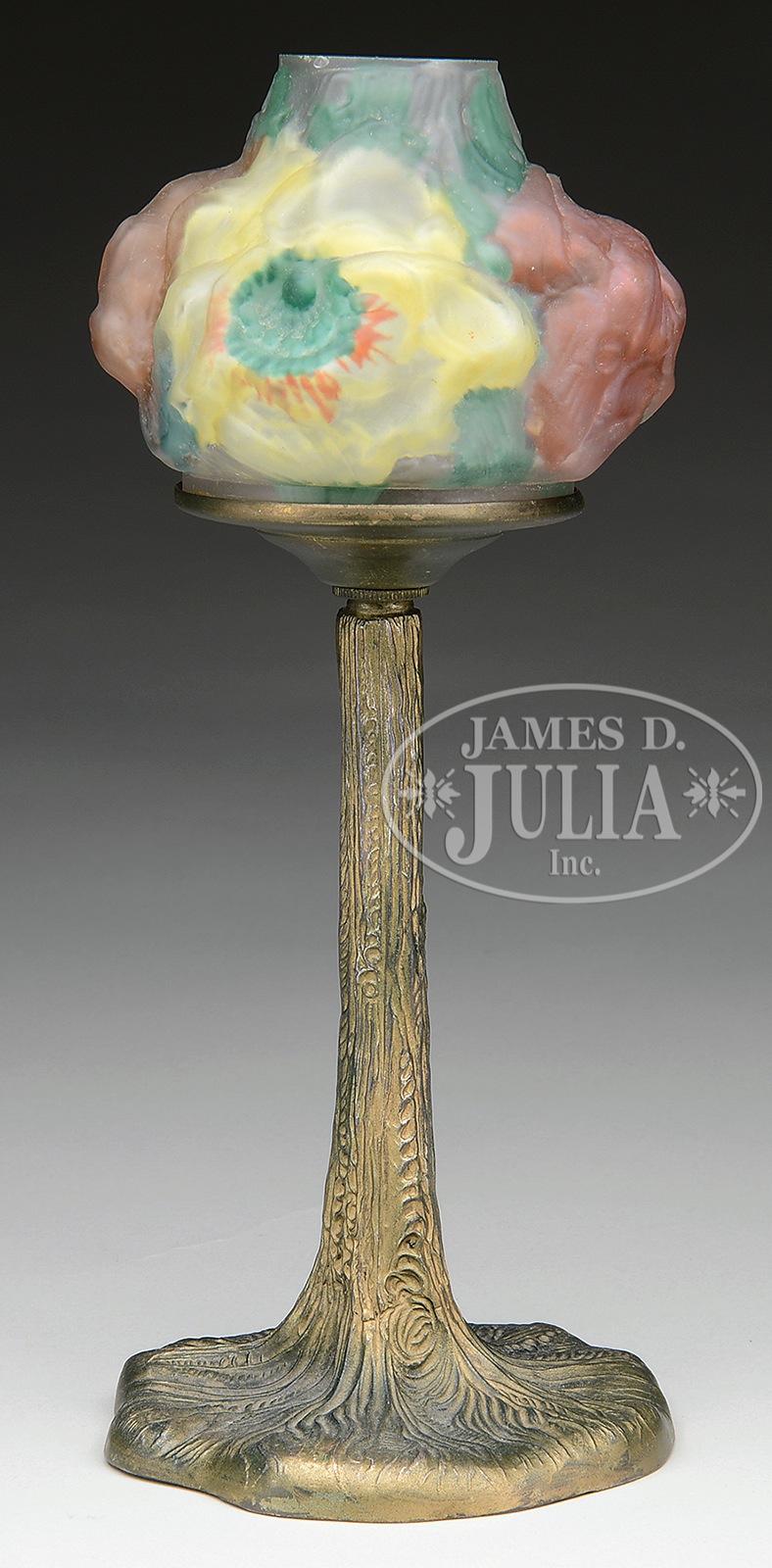 PAIRPOINT PUFFY BOUDOIR LAMP.Pairpoint boudoir lamp has 4 puffy flowers surrounding shade. Flowers are reverse painted in orange, yellow, red and green against a green leaf background. Signed on edge of fitter “The Pairpoint Corp”. Shade rests on a Pairpoint tree trunk boudoir base with gold finish. Signed on underside “Pairpoint B3079″ along with Pairpoint logo. SIZE: 10-3/4” t. CONDITION: Very good to excellent. 49777-2 (1,000-2,000) – Lot 1547