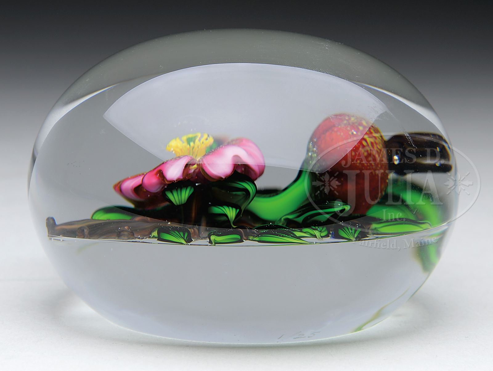 DEBBIE TARSITANO CAPE COD ROSE PAPERWEIGHT.Debbie Tarsitano single pink Cape Cod rose paperweight with rosehip on a branch with green leaves and bud having a starcut base. Signed on underside in cane “DT”. SIZE: 3-1/2″ x 2″ deep. CONDITION: Tiny scratch to edge of underside as well as a small air trap under flower. 50397-55 (300-500) – Lot 1548