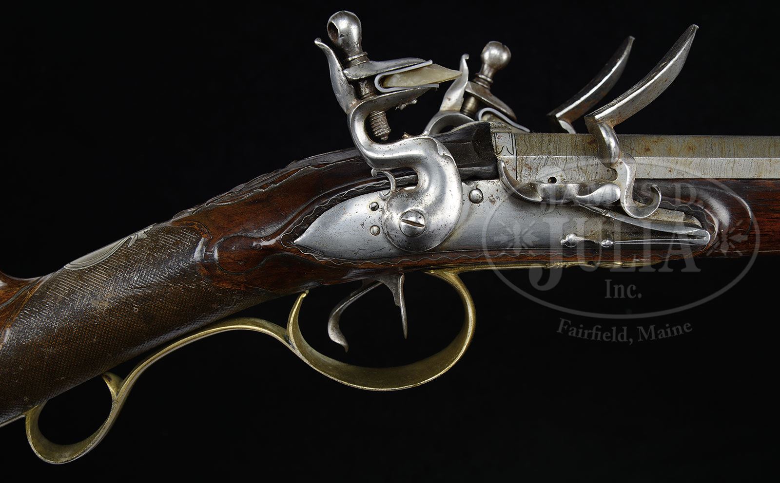 UNMARKED BRASS AND SILVER MOUNTED FRENCH DOUBLE FLINTLOCK SHOTGUN WITH VERY FINE ETCHED STUB TWIST BARRELS.SN NSN. Cal. 24 ga. .580 Bore diameter. 34-1/8″ Etched dramatic twist bbls have 8-1/2″ octagonal breech sections transition through 1-3/4″ sixteen sided area through wedding band to round. Brass front bead sits 4″ behind muzzles. Touch holes have platinum linings. Hickory ramrod with brass tip is held by single beaded brass pipe and brass thimble. Breech iron has deep sighting groove. Slightly curved, round bodied locks with semi-waterproof integral pans, and bridled friction frizzens, are fitted with tall serpentine round bodied cocks matching lockplates with two thin scrolled reinforces for neck. Brass furniture consists of scrolled grip trigger guard with acorn finial having stand-of-arms engraving on bow. Heavy brass buttplate has scalloped border, also with stand-of-arms at base of top tang, as well as nicely shaped beaded thimble. A vacant silver escutcheon with foliate finial is at top of grip. Dense, lightly figured European walnut stock has inlaid scrolled silver wire decoration around lockplates and scalloping of buttplate. Stock has nicely carved beads around locks with drop points. Stand-of-arms is relief carved at rear of top tang. Stock also features right hand scrolled cheekpiece and finely cut square checkering with broad mullered borders at grip. There is foliate carving and moldings around trigger guard. Bbls attach to stock with side nail through large scrolled silver escutcheons. A sling bail mounts through front of stock with matching loop on toe line. Minimum wall thickness: left -.040, right -.045. Drop at heel: 3-1/8″, drop at comb: 1-1/2″. Weight: 7 lbs 7 oz. LOP: 14-1/4″. CONDITION: Good. Bbls are finished in French gray with dark etched pattern. Locks are cleaned to silver gray. Stock retains most of what appears to be orig French polish over numerous light and heavy handling marks and dings.with added oil. Brass furniture shows cleaning and has remnants of old lacquer. Bores are good with some light pitting, mostly toward muzzles. Left bbl has some dark patches. Locks are crisp, frizzens a bit soft. Faces of frizzens are somewhat pitted. An interesting, nicely appointed, good quality, French double flint. 4-54001 MGM183 (3,000-5,000) – Lot 1549