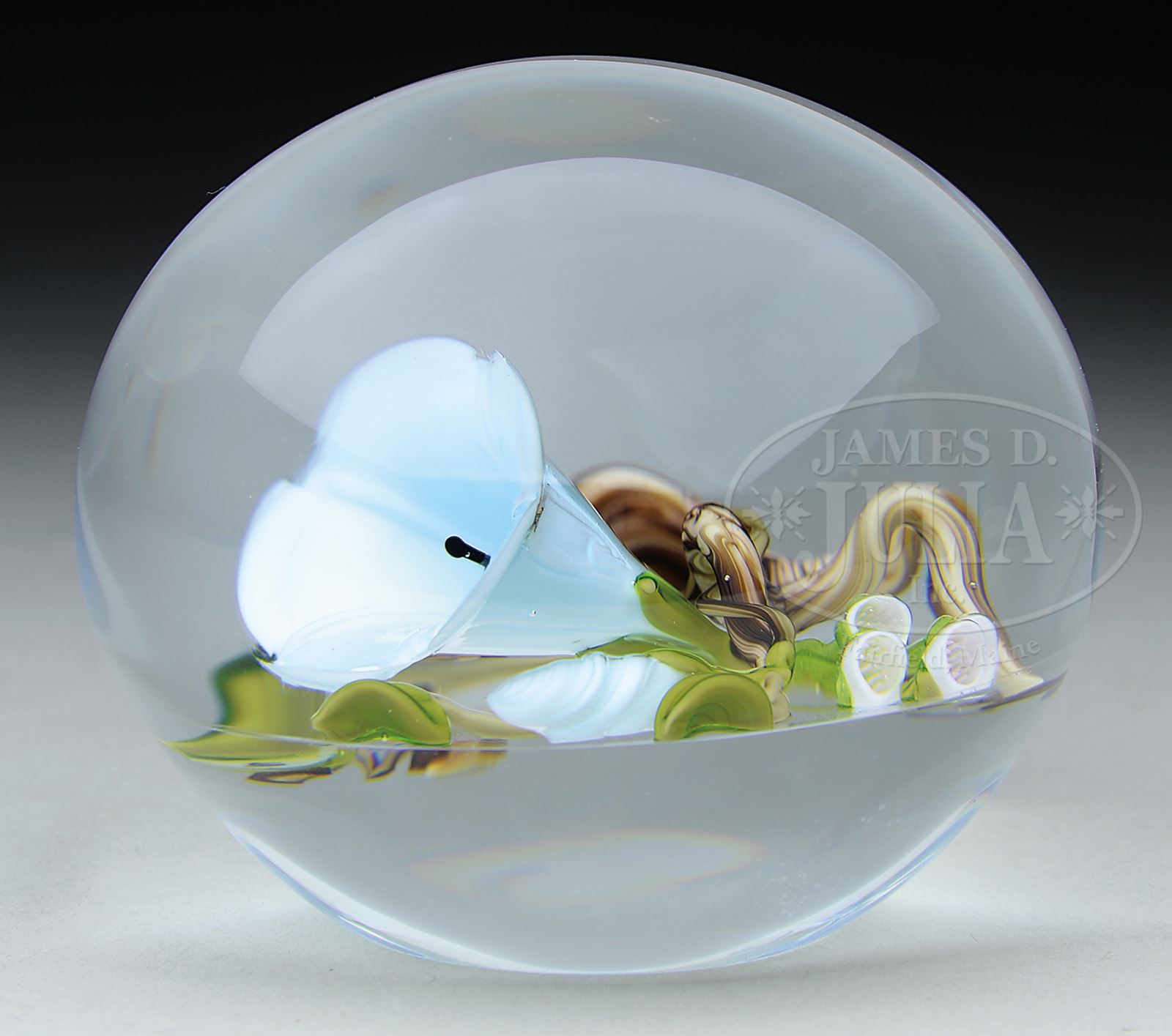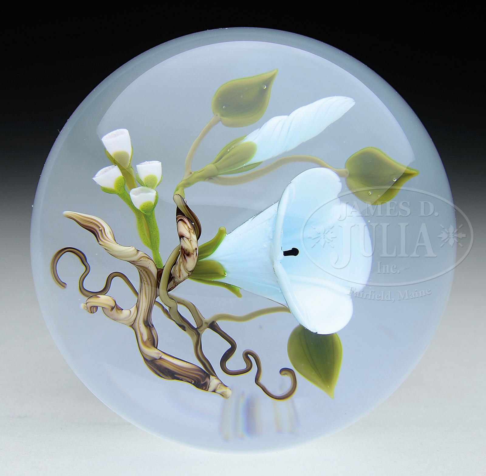 VICTOR TRABUCCO MORNING GLORY & BUD PAPERWEIGHT.Victor Trabucco paperweight with morning glory vine and blossom with bud along with white accent flowers and green leaves on a clear ground. Signed under green leaf “VT” within a cane as well as scribed at the base “Trabucco 1993 April 12”. SIZE: 3″ x 2-3/4″ deep. CONDITION: Very good to excellent. 50397-49 (300-500) – Lot 1551