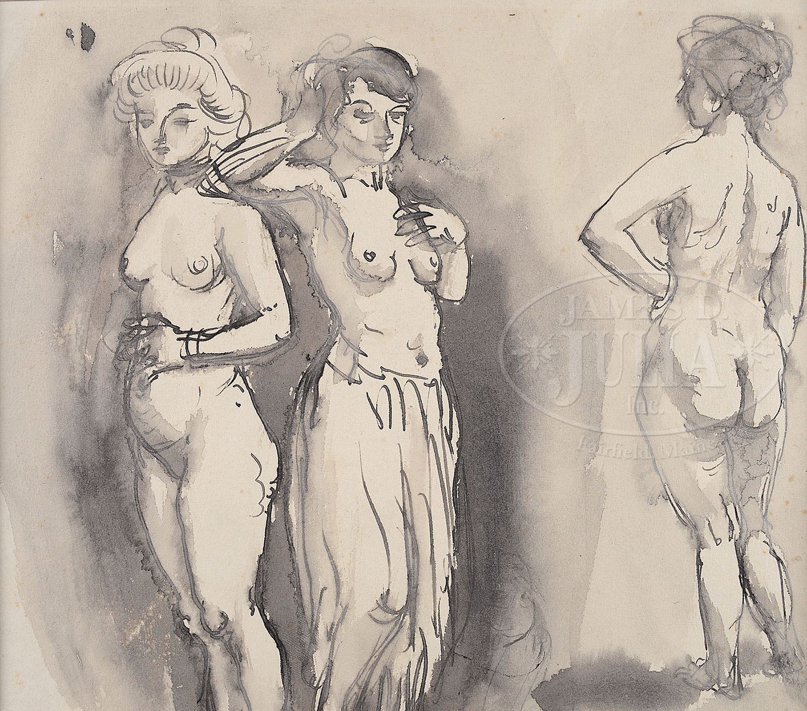 ATTRIBUTED SIR WILLIAM ORPEN (Irish, 1878-1931) THREE NUDES. Wash on paper Unframed Unsigned, artist identified on mat interior and inscribed: “From the collection of John Rothenstein”, stamped verso”Mr. Henry C. Pitz, 3 Cornish Place, Philadelphia”, Christie’s label on matting. SIZE: 9 3/4″ x 12 3/4″ Matting: 15″ x 18 1/2″. CONDITION: Very good. 7-70622 (800-1,200)