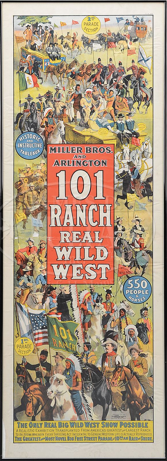 MILLER BROS. AND ARLINGTON 101 RANCH WILD WEST POSTER.Elaborate illustration depicts the extravagant parade this Wild West troupe would stage in each city prior to their scheduled shows. The wide variety of Wild West performers including sharpshooters, cowboys, Indians, caballeros, Cossacks and cavalrymen. Poster captioned along bottom “The Only Real Big Wild West Show Possible / The Greatest and Most Novel Big Free Street Parade at 10:30 AM Rain or Shine”. Copyright 1911 by The Strobridge Litho. Co., Cincinnati & New York. SIZE: Image: 19-1/2″ w x 56″ h. PROVENANCE: The Collection of Richard J. Miller. CONDITION: Generally very good but does have heavy creasing with some paper loss running through the middle of poster. 1-15037 (1,500-2,500) – Lot 1552 Auction: Advertising, Toy & Doll Auction - Fall 2014 Please Note: All prices include the hammer price plus the buyer’s premium, which is paid by the buyer as part of the purchase price. The prices noted here after the auction are considered unofficial and do not become official until after the 46th day. |