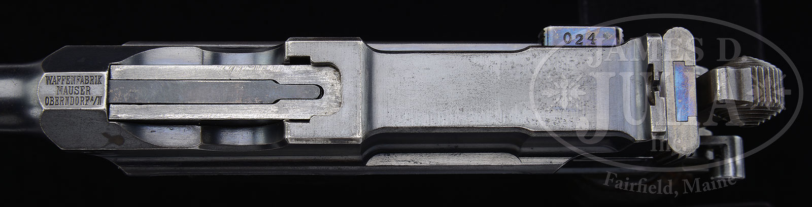 MAUSER C96 CONEHAMMER, FIXED SIGHT, WITH FACTORY MATCHING STOCK.SN 7346. Cal. 7.63 mm. Standard configuration fixed sight Conehammer with 4.75″ bbl, having a fixed front and rear sight. Chamber with usual 3-line address. Crown/Crown U proof on left side of bbl extension. Antler acceptance on right side. Full SN on back of frame, under locking lever, and repeated on back of hammer. Mismatched bolt assembly numbered “3224”, with replacement extractor. Bolt stop numbered “024”. All other parts are matching, including each of the grips. Lanyard ring present. Orig matching stock with repairs to lid and body including use of an external metal band. PROVENANCE: The Friedrich-Wilhelm Dauphin Collection – Germany. CONDITION: Approximately 70-80% orig rust blue with wear in front of mag housing and grip straps that have largely transitioned to a mellow patina. Comparable condition grips that are dark with oil staining and scattering of light handling dings. Dull bore with barely discernible rifling. Perfect manual mechanics. G-VG stock that has been sanded with previously noted repairs and lug with touch-up. Fixed sight Conehammers are seldom encountered, particularly with a matching stock. 49829-79 (5,000-10,000) – Lot 1553