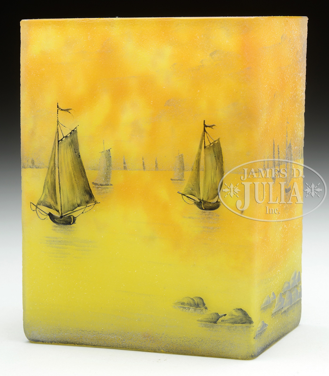 Daum Nancy rectangular vase has cameo & enameled nautical harbor scene with brown sailboats in the harbor with rocks in the foreground, all set against a yellow shading to mottled orange background. Signed on the underside in enamel “Daum Nancy” with the cross of Lorraine along with artist initials “AR”. SIZE: 4-3/4″ t. CONDITION: Very good to excellent. 1101-83 (3,000-4,000) – Lot 1555