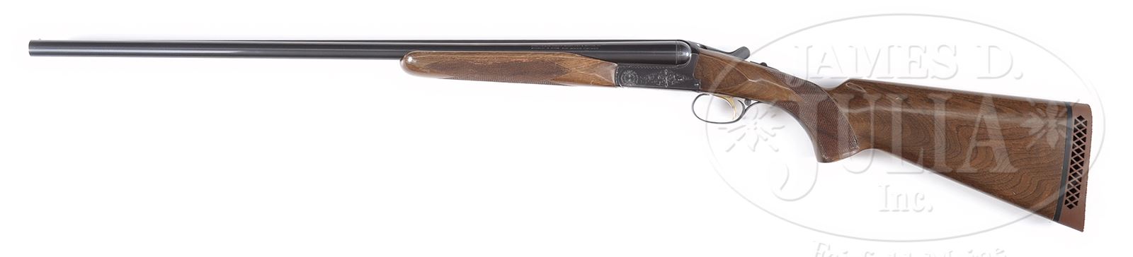 CASED BROWNING BSS 20 GAUGE.SN 01020RP168. Cal. 20 Ga. 26″ bbls. 3″ chambers. Choked Imp. Mod / Mod. Single selective trigger, auto ejectors, automatic safety. Full pistol grip stock LOP 14-1/2″ over Browning waffle pad, semi-gloss finish on wood. Beavertail forend. Receiver lightly engraved on sides as is trigger guard bow. Cased in Browning Hartmann case. Weight 6 lbs. 12 oz. PROVENANCE: Rod Fuller Estate Collection. CONDITION: Excellent overall. Stocks show minor handling marks. Checkering is crisp. Bbl and receiver retain most of their orig blue. Mechanics crisp. Case is fine showing minor handling marks. 49291-14 JSL43 (1,250-1,750) – Lot 1557