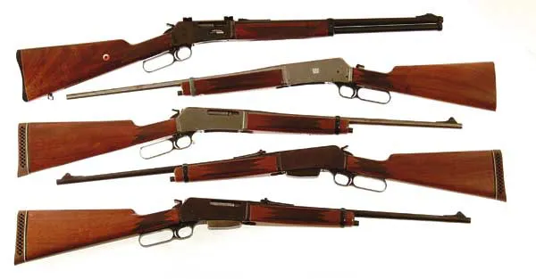 *COLLECTION OF TEN US MADE BROWNING BLR RIFLES. In the early 1960’s Browning began searching for a design for a rifle to compete with the Winchester Model 94, under the Browning name. They contracted with a brilliant firearms designer, named Karl Lewis, to design for Browning such a rifle. In a short period of time, Mr. Lewis had perfected his design and produced a prototype rifle with 19-1/2″ round bbl, full magazine tube with a front band similar to a Winchester. It was designed with a flat side receiver and a loading gate in the bottom. The lever was 1-pc with integral trigger that moved with the lever. Mr. Lewis designed a round 1-pc solid rotating bolt specifically for this rifle. This bolt became a subsequent bone of contention between Browning and Lewis when Lewis wanted the patent rights to it. Browning simply redesigned the bolt into a 2-pc system and gave Lewis a cash settlement. The rifle was redesigned during its testing stage and the original sample has a 1/4″ spacer in placed at the rear of the ejection port. It also has other small modifications done to the right side of the receiver. Lewis’ original design has a heavy machined forearm band that is not reminiscent of anything previously known. Browning contracted with the TRW Corp. of Cleveland, OH to continue with design and production of this rifle. Over a two year period that Browning and TRW were working to perfect this design, it is estimated that all together only approximately 250 “MADE IN USA” Browning lever action rifles were ever made, although there were pieces and parts for possibly up to 400 more, in various stages. Of these, only about 50 were ever delivered to Browning for inspection. Just 16 of them were accepted with the remaining 34 rejected. Four of them were sent to FN for testing and pattern use, and subsequently returned to Browning. Three were sent to the Browning Arnold, MO facility. Two of the 16 were presented to the Browning R & D Historical Library and two were disposed of. The nine remaining rifles, including the four FN test rifles and the original Lewis pattern rifle, along with tubular magazine, remained at the Utah Facility until 1981 when FN bought Browning. At that time, the 34 rejected rifles were returned to PRW for re-work or disposal. The 9 remaining rifles were subsequently sold to a local gun dealer who offered them for public sale, along with to the original Karl Lewis rifle. These 10 rifles represent the only known legal sales of “MADE IN USA” Browning lever action rifles, although TRW made a number of presentations to executives and several were apparently obtained VIA the “LUNCHBOX SPECIAL” method. This lot is accompanied by a 7-page article by William G. Fohrman from the 1992 “GUN DIGEST”, giving great detail on the development and production of U.S. made Browning lever action rifles. 1) This rifle has an 8-5/16″ long “H”-style checkered forearm, straight stock with checkered wrist and an unusual cast aluminum buttplate. It also has a 1/2″ tack in the left side of the buttstock with the number “96” etched on it and it has a tiny sling swivel. There is the number “B7″ stamped on the bottom of the receiver, just forward of the loading port and that may be the SN. The right side of the receiver has a black and silver Browning property tag No. 1892. CONDITION: Excellent. Metal retains 96-98% strong original blue with a couple of touched up modifications on the right side of the receiver. The wood is sound and retains most of its original finish on the forearm while the buttstock finish has alligatored. Bright shiny bore. 2) SN 6K01001. This is the first production sample made at TRW in Cleveland, OH. It is in Cal. 243 with 20” tapered round bbl, ramp front sight and standard Browning rear sight. It has a flat sided checkered forearm and straight stock with checkered wrist and Browning waffle pad. It also has the early 1st-style American magazine with checkered side panels, still in the white. The right side of the bbl is marked with the SN, “MADE IN USA” and “PATENT PENDING”. CONDITION: Excellent. Retains about all of its original factory finish to both metal and wood with only minor handling and storage nicks and scratches. 3) SN 6K1002. Cal. 243. This is the 2nd production sample produced at TRW and is identical to #2 above, with the same dimensions and configuration. It also has the 1st-style magazine with checkered side panels and is blued. CONDITION: Excellent, plus. Retains about all its original factory finish to both metal and wood with only minor handling and storage nicks and scratches. 4). SN 6K01015. Cal. 243. This is a factory cut-away in the same configurations as #2 & #3 above with both sides cut away to expose the inner workings, probably not as a salesman display but as an engineering tool. The chamber is also cutaway and therefore, this is not to be considered a firearm. CONDITION: Excellent, as stated, retains most of its original factory finish with a cleaned area on the right side of the receiver and light freckling of rust on the left side. Fine wood with minor nicks and scratches. No magazine. 5) SN 6K01036. Cal. 308. Identical to #2 above with the same configuration. CONDITION: Appears to be new, unfired retaining about all its original factory finish to both metal and wood. Missing the magazine. 6) SN 6K01256. Cal. 243. Identical to #2 above with the same configuration. CONDITION: Appears to be new, unfired retaining all its original factory finish to both metal and wood. Missing the magazine. 7) SN 6K01633. Cal. 308. Reported as an Fabrique Nationale (FN) tooling pattern rifle identical to #2 above with Belgian proofs on the left side of the receiver and bbl. It is apparently a rifle made at TRW and shipped to FN when Browning transferred the contract to them for production. CONDITION: As new, appears to be unfired retaining all its original factory finish to both metal and wood. 8) SN 6K02322. Cal. 243. Id