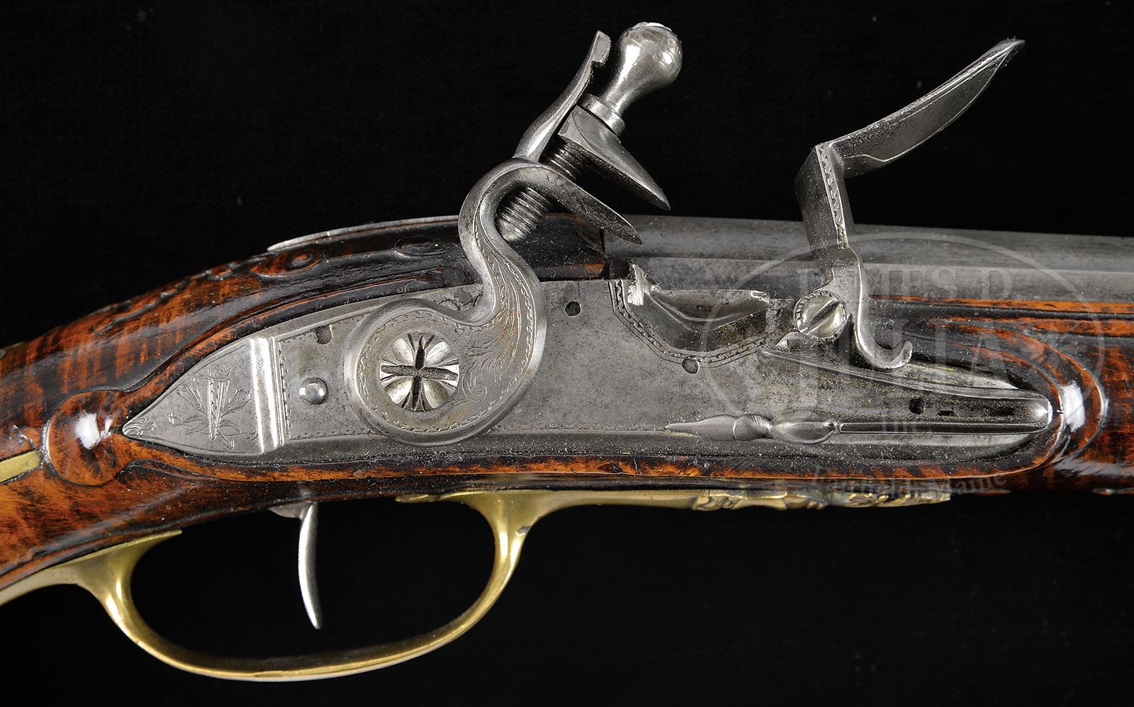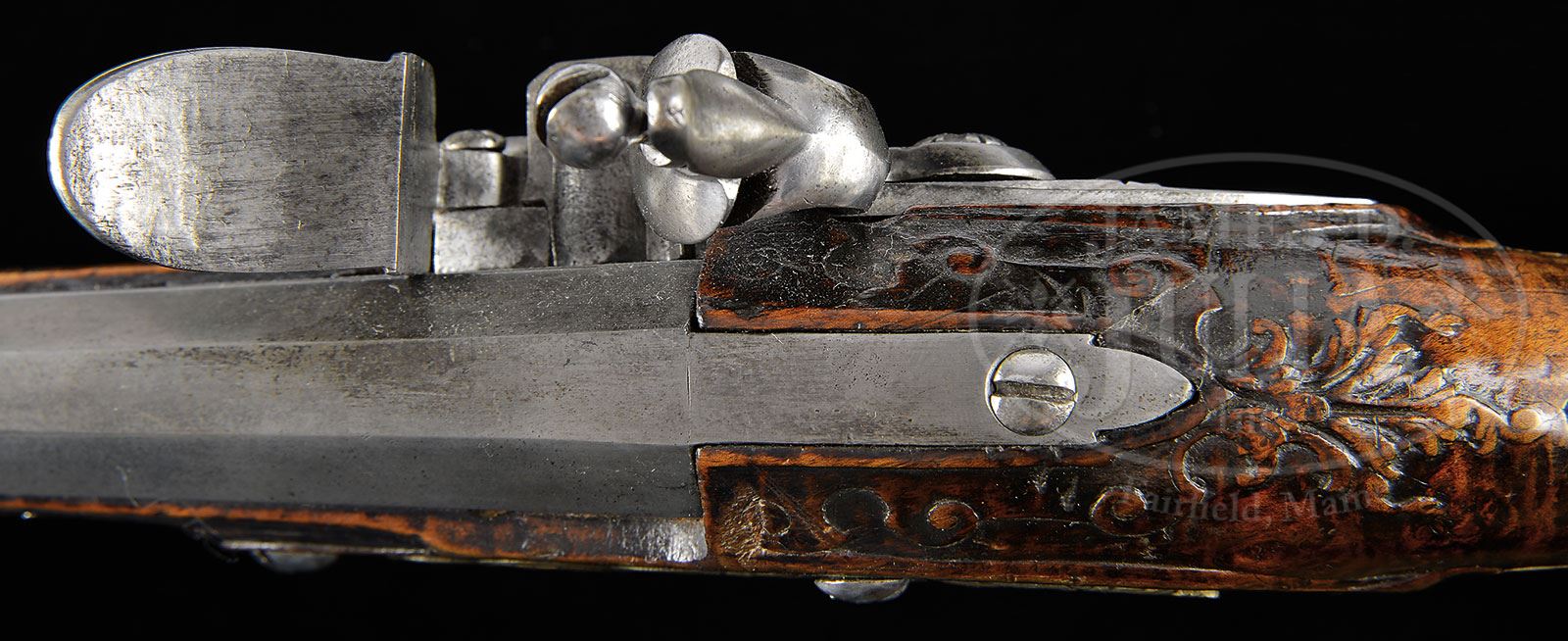 SN NSN. Flat lockplates with stepped tail sparsely engraved with trophies of arms. Gooseneck cocks lightly engraved. Bbls are octagonal at breech and round at muzzle with brass foresights. Figured walnut full stocks molded with carving at breech and rear ramrod pipe. Full brass furniture with spurred butts with grotesque mask butts. An attractive and original pair of mid-18th century flintlock holster pistols. PROVENANCE: Collection of Dr. Douglas Sirkin. CONDITION: Metal is good throughout with grayish patina. One top jaw an obvious replacement. Hammer on one pistol replaced. Stocks are good throughout. Brass furniture with openwork sideplates crisp. 4-49911 (8,000-12,000) – Lot 1558