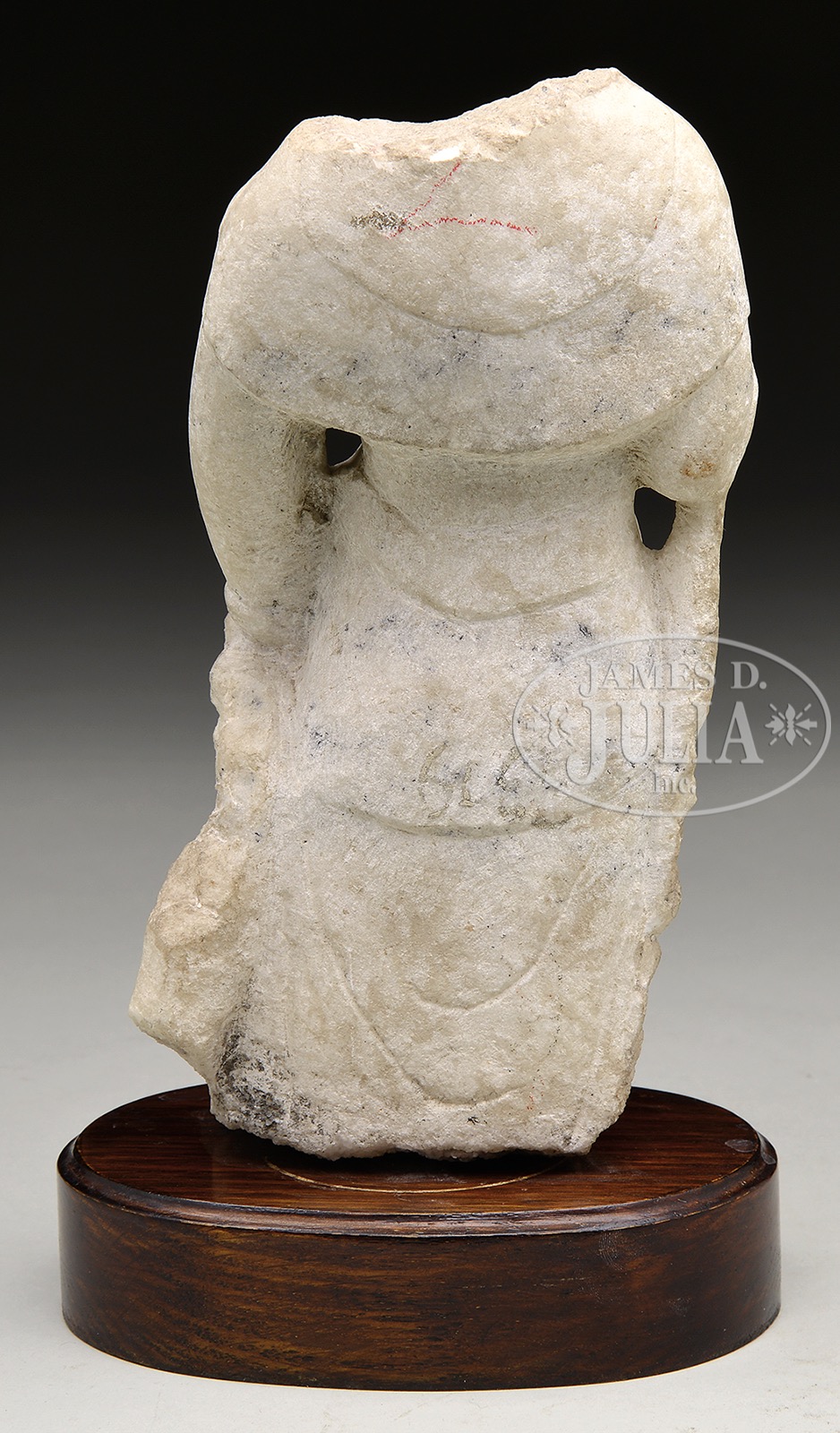 CARVED WHITE MARBLE TORSO.Ming Period (1368-1644), China. Draped figure of the Buddha. Accompanied by hardwood museum stand. SIZE: 9″ h x 5-1/2″ w. PROVENANCE: Ex-C.K. Chan collection. From an important American private collection. CONDITION: Age wear. 45961-2 (2,500-3,500) – Lot 1560