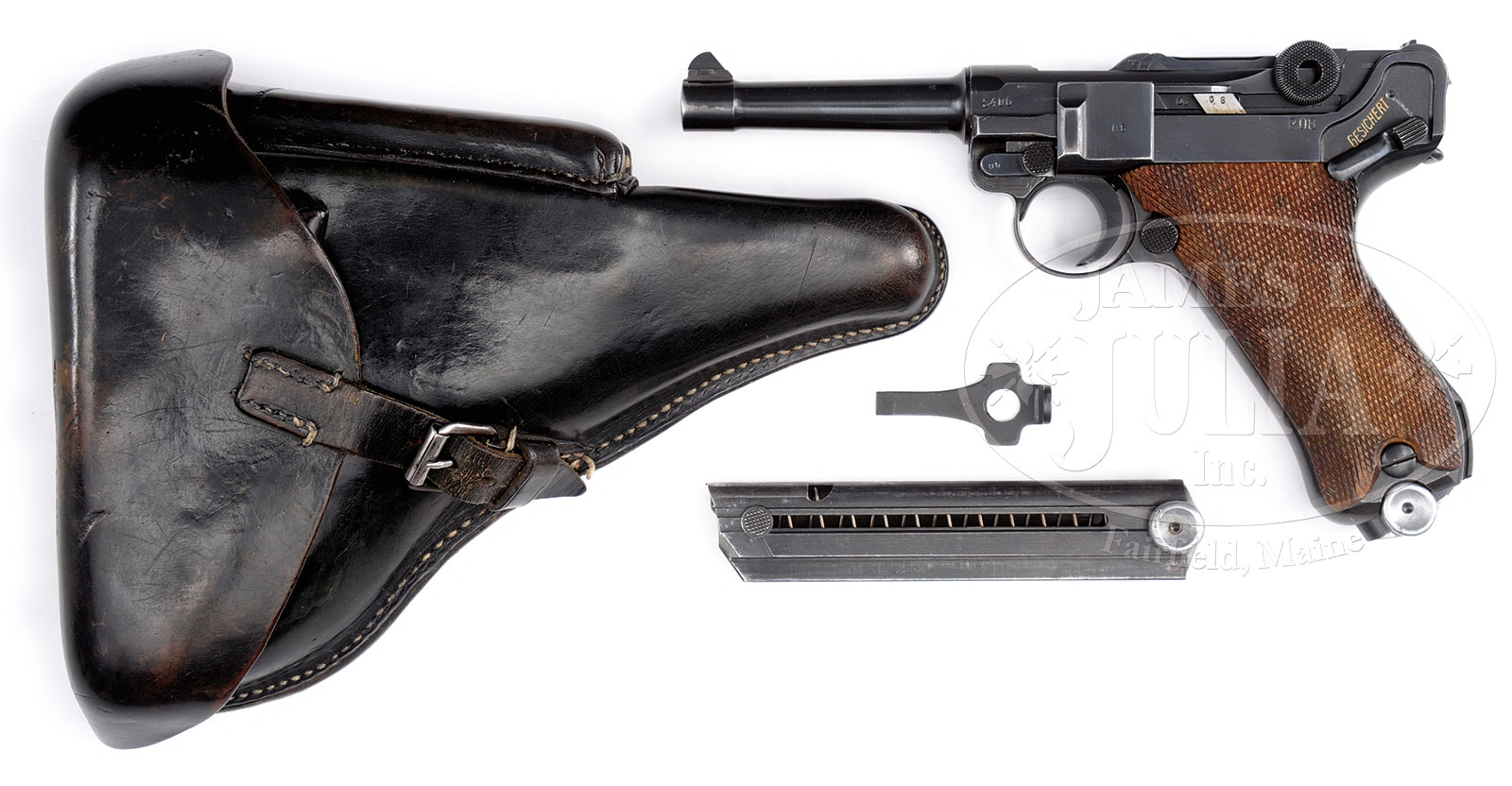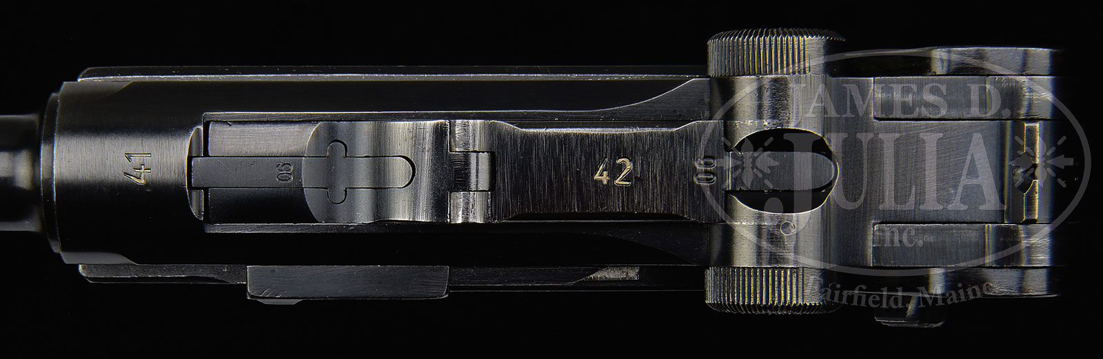 SN 3406O. Cal. 9mm. 4″ bbl, blue finish overall with 2-pc checkered walnut grips. Chamber dated “41” with toggle marked “42”, being German code for Mauser. Left side of chamber has full “5406” SN. Right side of chamber has German inspection “Eagle 655”. Frame SN 3406 (o) series. Gun has two FXO Eagle 37 unnumbered aluminum bottomed magazines. With Eagle 655 inspected takedown/loading tool and egr42 hard shell P-08 holster. After detailed disassembly, all numbered parts are matching. CONDITION: Very fine overall, with slight finish loss at muzzle and side of front sight from holster carry. Trigger plate having similar finish loss as well as leading edges of frame. Very bottom of frontstrap and stock lug all have typical holster carry finish loss. Walnut grips are very fine with only slight wear at very bottom edges. Magazines are excellent with most blue finish remaining. Holster has most black finish remaining with just slight wear and good bold white cotton stitching. A very fine Luger rig. 51591-7 (2,500-4,500) C&R – Lot 1563