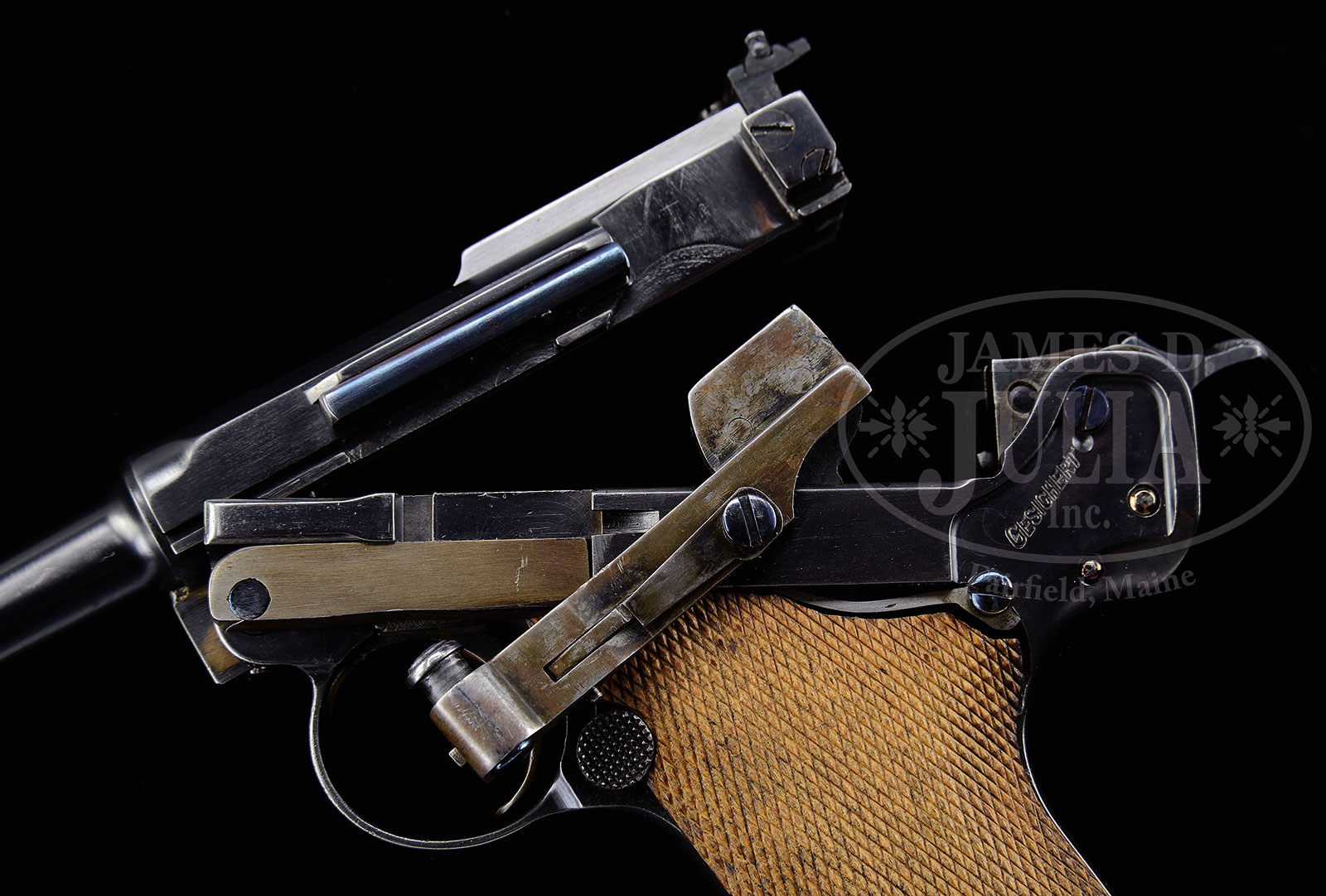 *WILD AND CRAZY A.W. PETERSON .22LR LUGER CONVERSION, POSSIBLY ONE OF A KIND.NSN. Cal. 22. Extremely interesting and unnecessarily complicated .22 LR single shot pistol based on a standard Luger frame and marked in the area of the previous breechblock “REMODELED BY / A.W. PETERSON & SON / DENVER”. 5.25″ sleeved bbl having a vertically adjustable front sight and a horizontally adjustable rear sight. The hinged bbl and receiver assembly are released by depressing a plunger mounted to the left side of the frame and rotating the attendant arm downward. At the same time, a spring inletted into the right frame rail pushes against the adjacent button, connected to the extractor, to lift the cartridge out of the chamber. The conversion also implements an external hammer and uses the magazine more as a place holder than a feeding device. Mag now presents as an in-the-white shell secured to a newly manufactured wood plug with two hollowed pins. Checkered walnut panels modified from the orig Luger and grip screws replaced by smaller head screws with a washer. PROVENANCE: The Esteemed Collection Of Noted Expert And Author Warren Buxton. CONDITION: Presents with at least 98% reapplied rust blue with only slight sharp edge thinning. The small parts are in comparable condition, suggesting that this converted pistol, admittedly awkward to use, was shot very little. Mirror bright bore. Perfect manual mechanics. You can be the only one on your block, and probably the only one in your shooting club, with this pistol, the ultimate oddity for a Luger collector! 51568-29 LMA (1,500-3,000) C&R – Lot 1564