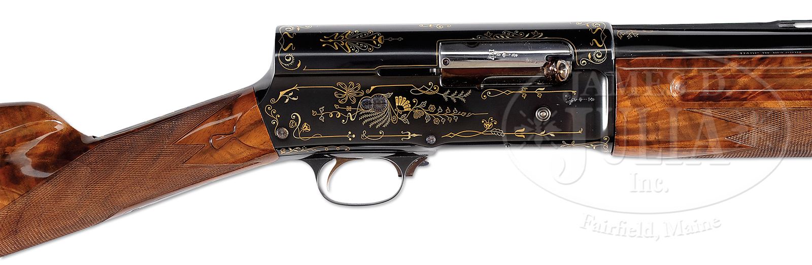 *FINELY REFURBISHED PRE WAR BROWNING A5 GRADE IV WITH EXTRA BARRELS AND CASE.SN 80334. (1928) Cal. 12 ga. 2-3/4″ Chambers. This spectacular pre war Browning has five sets of bbls, 30″ with full choke, 26″ with skeet, 25″ and 24″ with Cutts compensators, and 26″ with poly choke. Blued action is flush 2-color gold inlaid with classic grade IV presentation of scrolling ribbons, leaves and flowers. Stocks of crotch figured American walnut are nicely checkered, buttstock featuring drop points and FN buttplate. Weight: 8 lbs 14 oz. LOP: 14-3/8″. Gun and two fixed choke bbls are housed in brown Browning case. PROVENANCE: Consignors notes. The Collection of Robert Burg. CONDITION: Excellent, essentially as new, as completely and expertly refurbished in the Arnold Gun Shop. Spectacular. 49503-34 MGM331 (6,000-10,000) – Lot 1566 Click here to view provenance