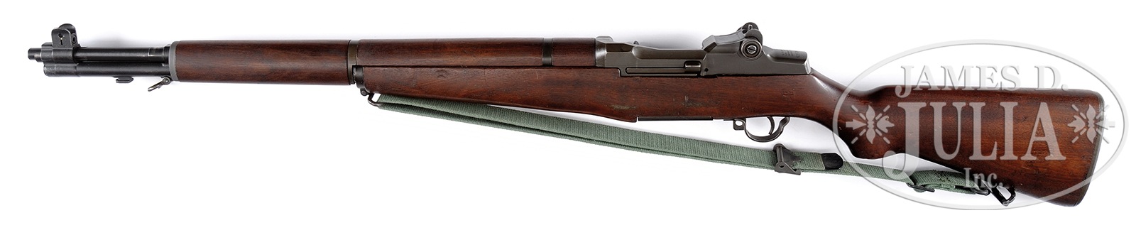 *SUPERB M1 GARAND RIFLE BY INTERNATIONAL HARVESTER.SN 5153976. Cal. 30-06. 24″ LMR bbl dated 2-54. 3-pc “IHC” inspected stocks with dark gray military phosphate finish overall. “IHC” internal components as well as trigger group, op rod and bolt. Accompanied with late canvass sling. PROVENANCE: From High Condition Collection of Discerning U.S. Military Rifle Collector, Offered Without Reserve. CONDITION: Very fine overall with most all military phosphate finish remaining on metal. Excellent bore and mechanics. Very fine walnut stocks with period inspectors marks and proofs. 50909-8 TDW (1,200-2,000) C&R – Lot 1566