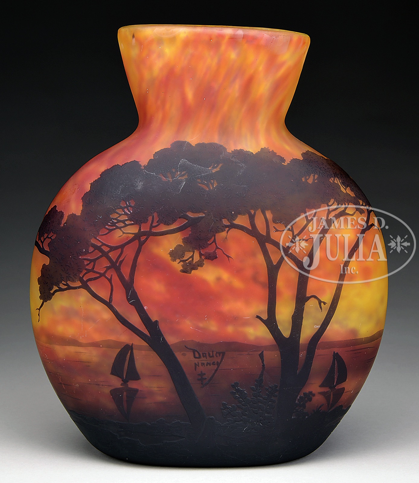 DAUM NANCY NAUTICAL SCENE VASE.Large Daum vase has dark brown cameo decoration of trees in the foreground framing a lake with two sailboats and mountains in the distance. Cameo scene is set against a mottled yellow and orange background giving the perception of a sunset sky. Signed on the side in cameo “Daum Nancy” with the cross of Lorraine. SIZE: 12-1/2″ t. CONDITION: Very good to excellent. 48919-1 (2,000-3,000) – Lot 1567