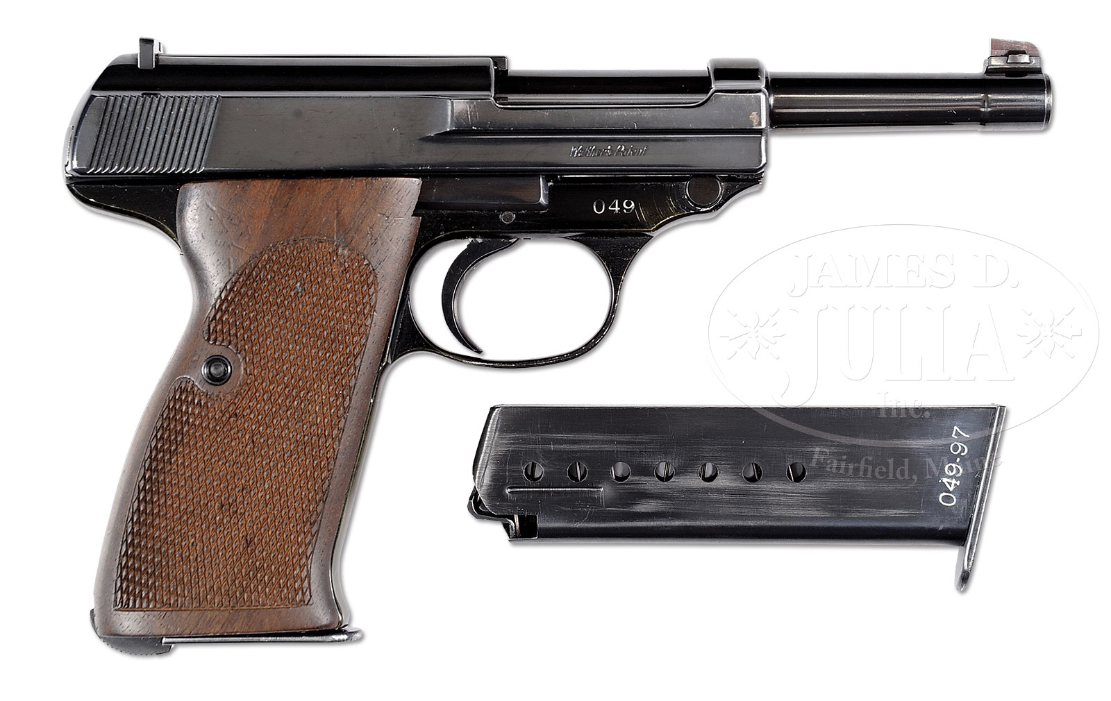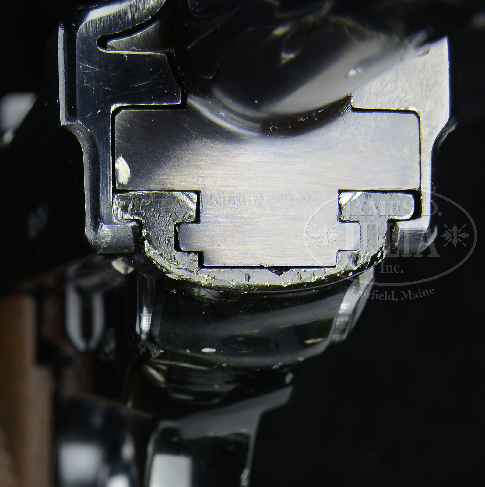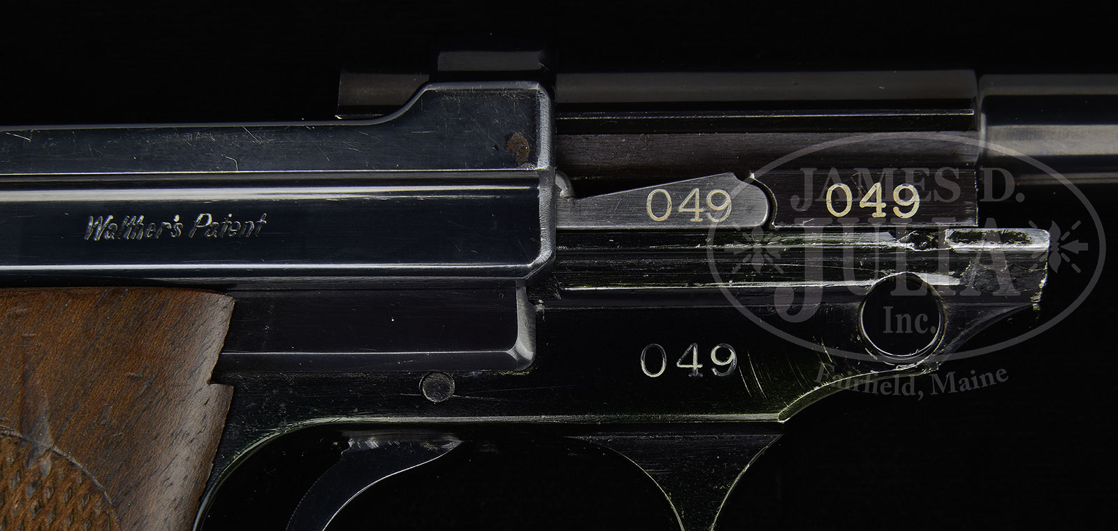 *FANTASTIC WALTHER AP MILITARY TEST PISTOL, ALLOY FRAME, TWO MAGAZINES.SN 049. Cal. 9mmp. Walther made a series of about 50 Armee Pistoles, all double action with an internal hammer, for testing prior to the military’s acceptance of the P38. Most had a 5″ bbl and an unslotted frame that was made of steel. A small number of the very last pistols had an alloy frame. Regardless of variation, Walther AP pistols are considered one of the Holy Grails of Walther and military pistol collectors. This late production gun has a drift adjustable front and a “U” notched rear sight. The sides of the slide were made with ridged reinforcement. The left side is marked “Waffenfabrik Walther Zella-Mehlis (Thur)” surmounting the Walther banner and the model denomination “Armee-Pistole Cal. 9mm”. The slide mounted safety lever, toward the rear of the slide, has the fire position denoted by a recessed red dot. The right side of the slide is simply marked “Walthers Patent”. The right side of the alloy frame, that shows a little damage on right side just forward of takedown lever axle, is marked with the serial number 049 in large digits that are repeated on the slide, the bbl, and the locking block. All of these parts, except the locking block, are also stamped with a much smaller inspection number “28”. The pistol has standard wooden AP grips, the left with a circular recess for a lanyard ring. They are each stamped “28” with the number repeated in pencil. Magazine number 049-0 (or 049-partial”9″) has original finish but should have been numbered 049-98. The second magazine 049-97 is an exceptionally well-made replacement. PROVENANCE: The Esteemed Collection Of Noted Expert And Author Warren Buxton. CONDITION: Approximately 97%-98% bright original blue with sharp edge wear around the muzzle and forward slide. Frame has about 75-80% of anodizing with front strap thinned to a greenish hue. Small defects of right side of forward frame as previously noted. Mirror bright bore. Perfect manual mechanics. One of the toughest of the APs to encounter in high condition. 51568-27 LMA (27,500-35,000) C&R – Lot 1567