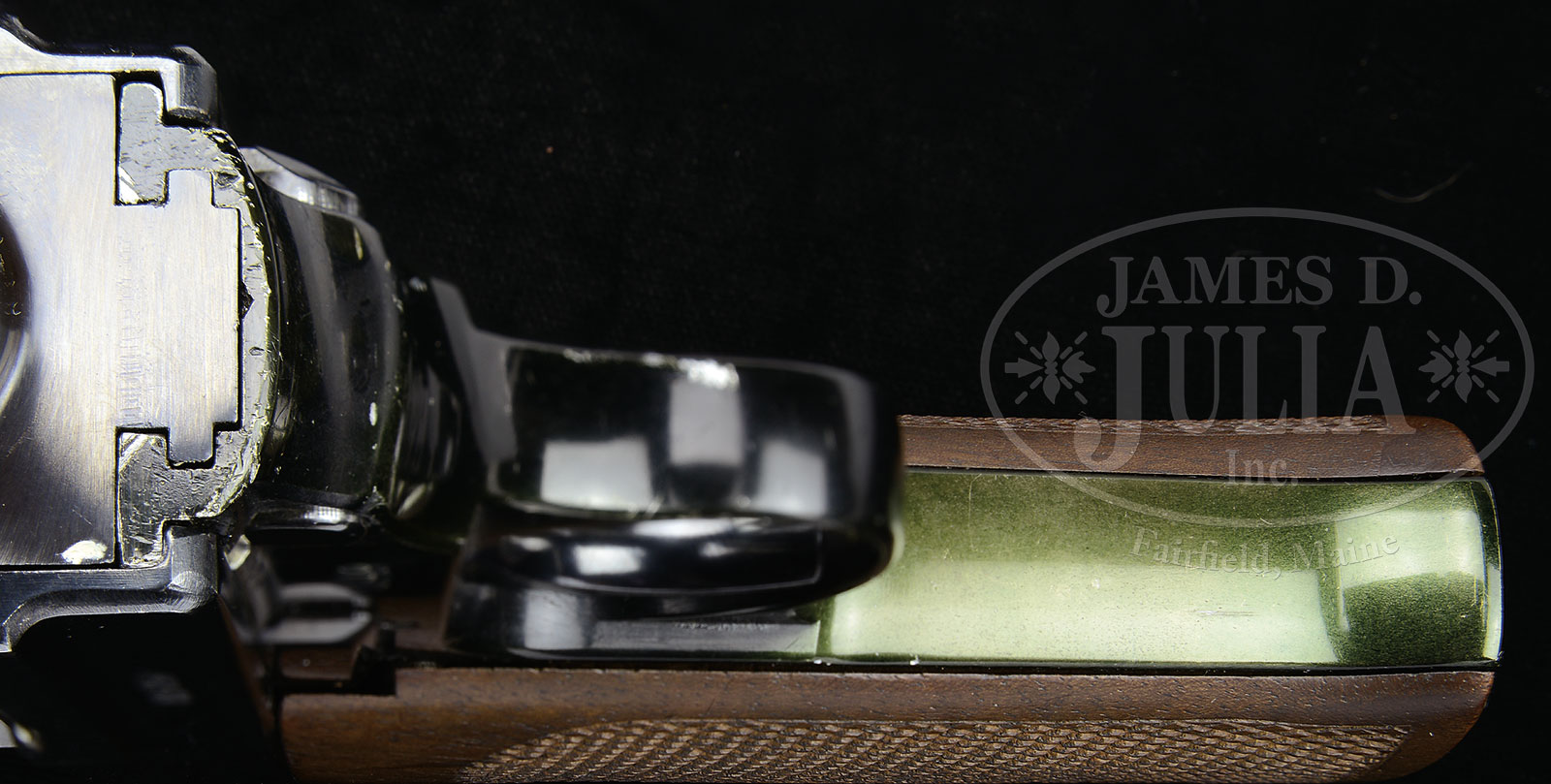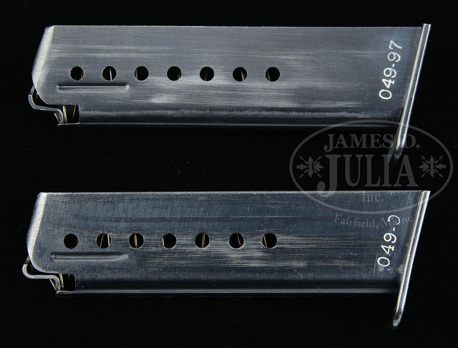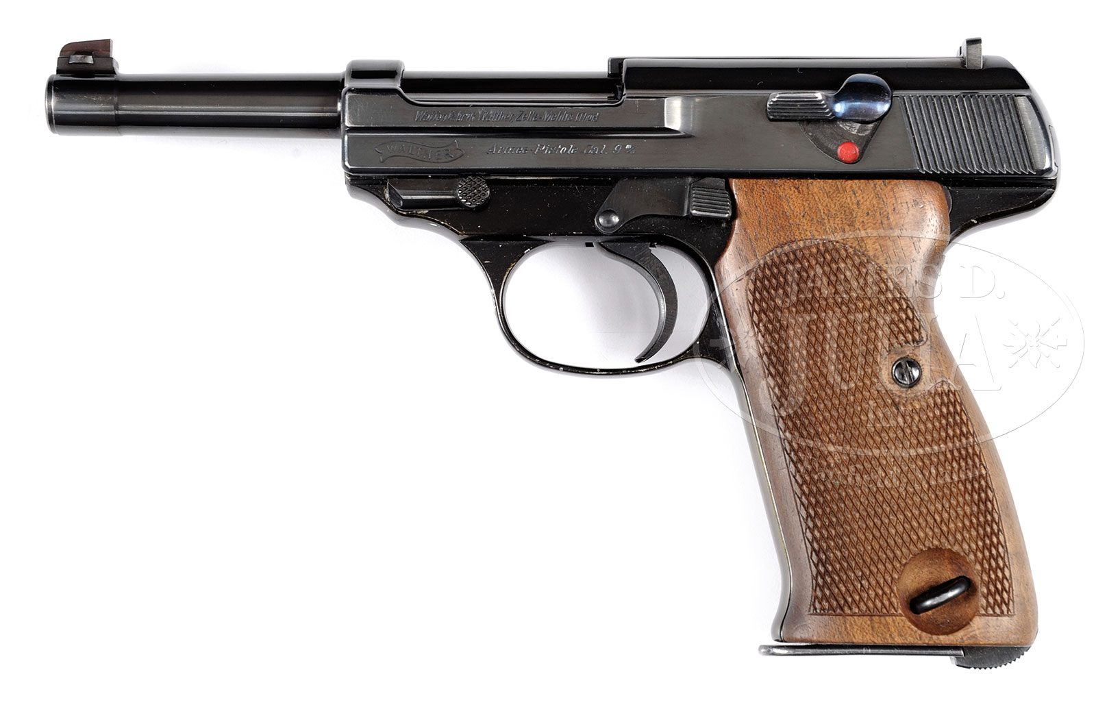 *FANTASTIC WALTHER AP MILITARY TEST PISTOL, ALLOY FRAME, TWO MAGAZINES.SN 049. Cal. 9mmp. Walther made a series of about 50 Armee Pistoles, all double action with an internal hammer, for testing prior to the military’s acceptance of the P38. Most had a 5″ bbl and an unslotted frame that was made of steel. A small number of the very last pistols had an alloy frame. Regardless of variation, Walther AP pistols are considered one of the Holy Grails of Walther and military pistol collectors. This late production gun has a drift adjustable front and a “U” notched rear sight. The sides of the slide were made with ridged reinforcement. The left side is marked “Waffenfabrik Walther Zella-Mehlis (Thur)” surmounting the Walther banner and the model denomination “Armee-Pistole Cal. 9mm”. The slide mounted safety lever, toward the rear of the slide, has the fire position denoted by a recessed red dot. The right side of the slide is simply marked “Walthers Patent”. The right side of the alloy frame, that shows a little damage on right side just forward of takedown lever axle, is marked with the serial number 049 in large digits that are repeated on the slide, the bbl, and the locking block. All of these parts, except the locking block, are also stamped with a much smaller inspection number “28”. The pistol has standard wooden AP grips, the left with a circular recess for a lanyard ring. They are each stamped “28” with the number repeated in pencil. Magazine number 049-0 (or 049-partial”9″) has original finish but should have been numbered 049-98. The second magazine 049-97 is an exceptionally well-made replacement. PROVENANCE: The Esteemed Collection Of Noted Expert And Author Warren Buxton. CONDITION: Approximately 97%-98% bright original blue with sharp edge wear around the muzzle and forward slide. Frame has about 75-80% of anodizing with front strap thinned to a greenish hue. Small defects of right side of forward frame as previously noted. Mirror bright bore. Perfect manual mechanics. One of the toughest of the APs to encounter in high condition. 51568-27 LMA (27,500-35,000) C&R – Lot 1567