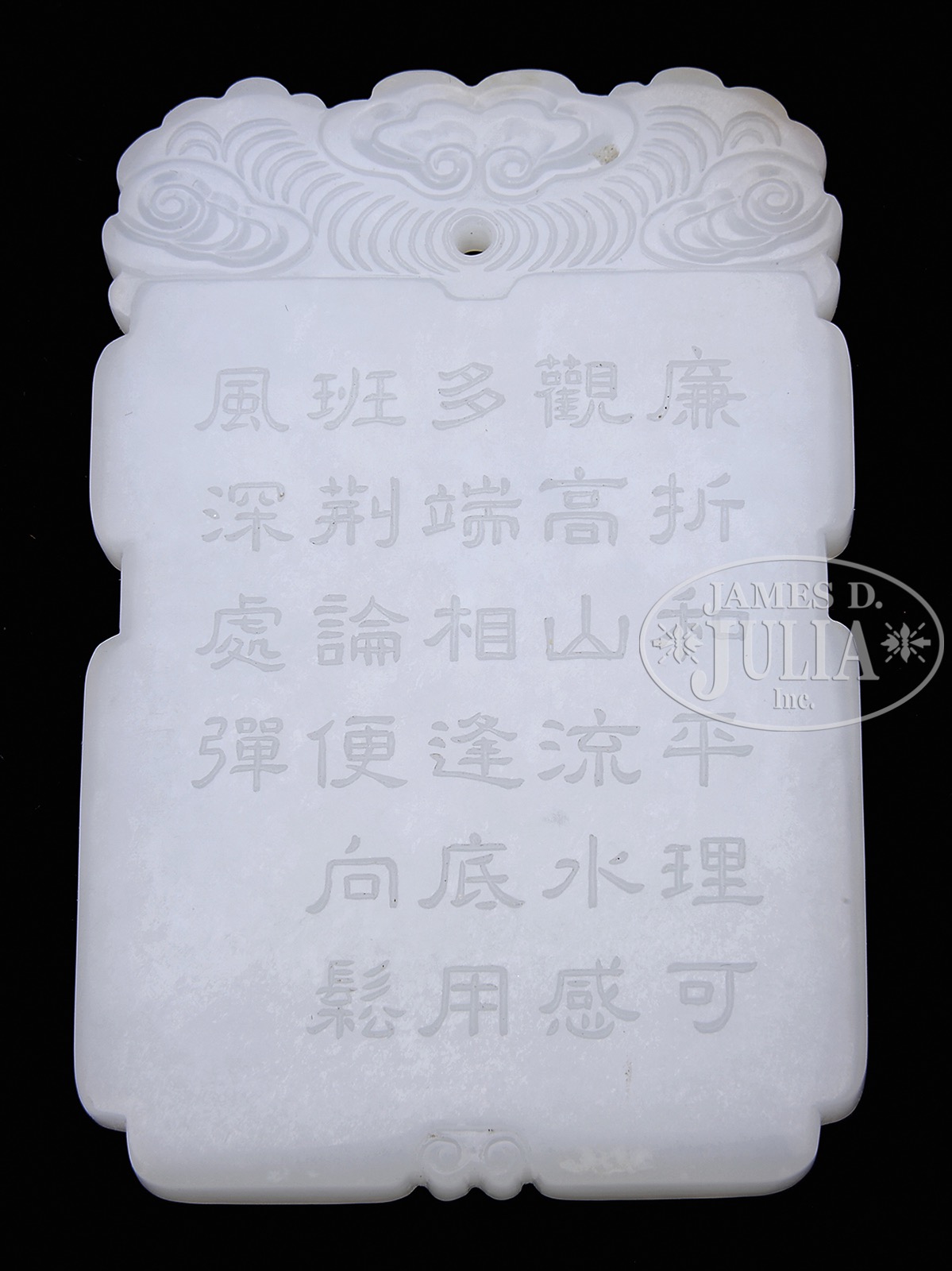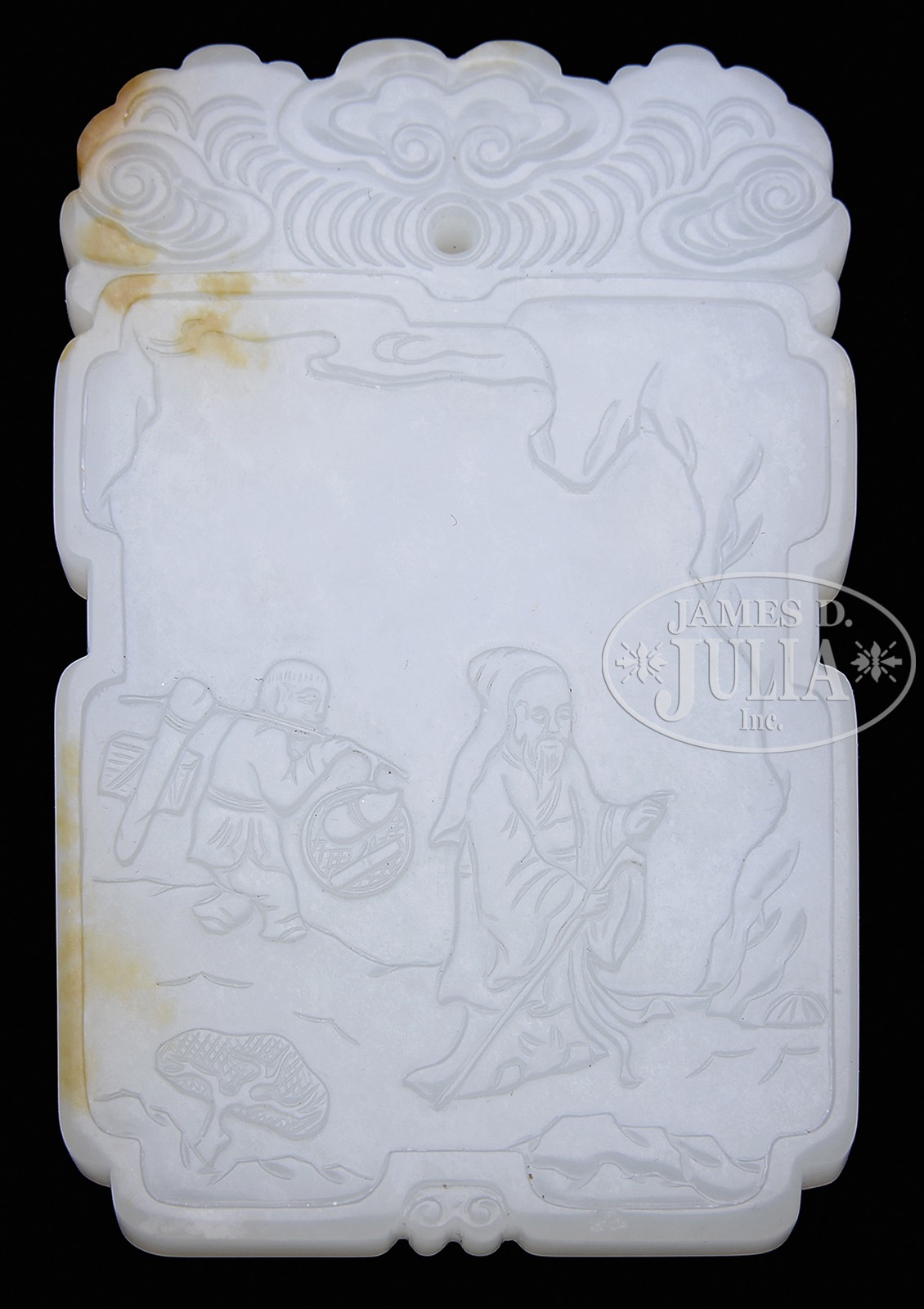 China, 20th century. The pendant carved from a white stone with small russet inclusions. One side decorated with a scene of two figures walking in a landscape and a large group of script on the reverse. SIZE: 2-1/2″ t. CONDITION: Very good. 51296-9 (6,000-8,000) – Lot 1567