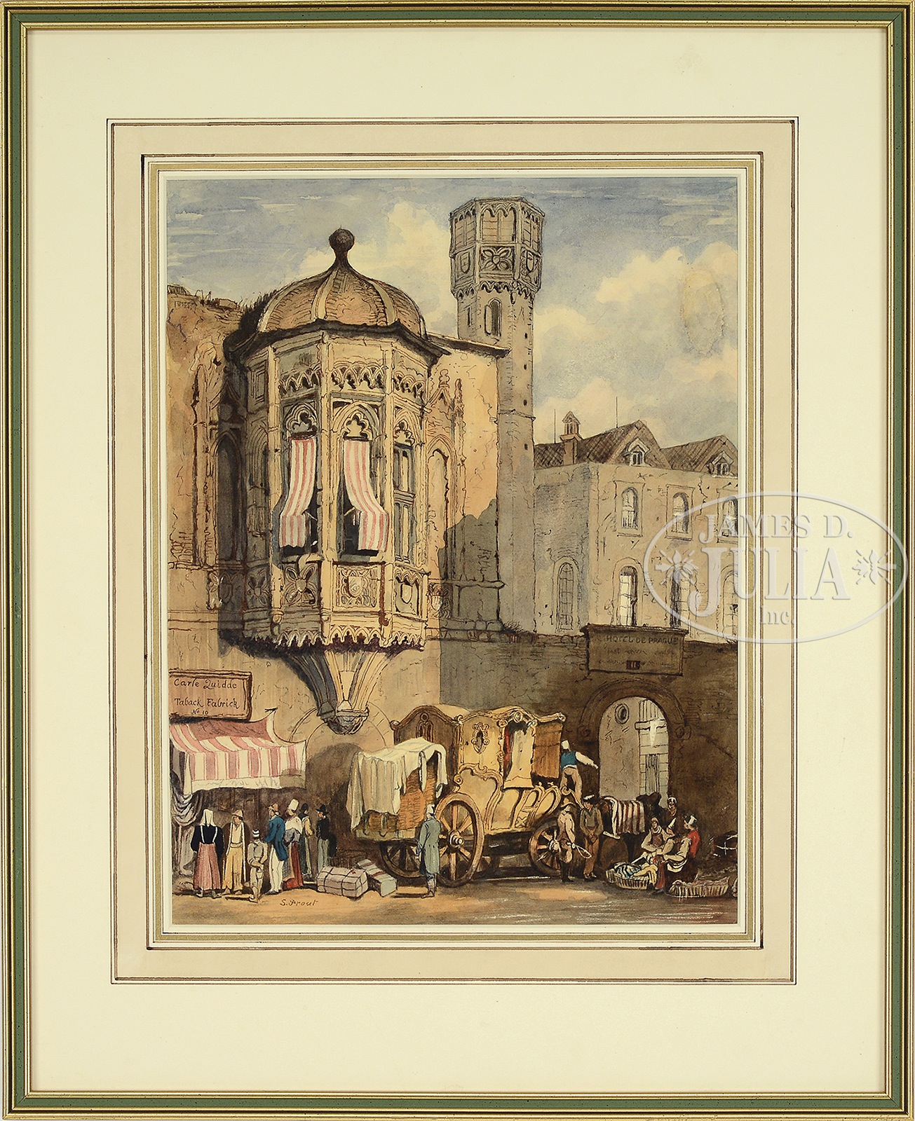 SAMUEL GILLESPIE PROUT (English, 1822-1911) “CATHEDRAL” and “HOTEL DE PRAGUE”.Two watercolors highlighted with white gouache Housed in different modern frames, matted under glass Each signed “S. Prout”, one lower left, the other lower right SIZE: Sight: 15″ x 11″. Overall: 23″ x 18″ CONDITION: Very good, with minor discoloration, one has waterstain in upper right (not examined out of frames) 50593-5 (800-1,200) – Lot 1568