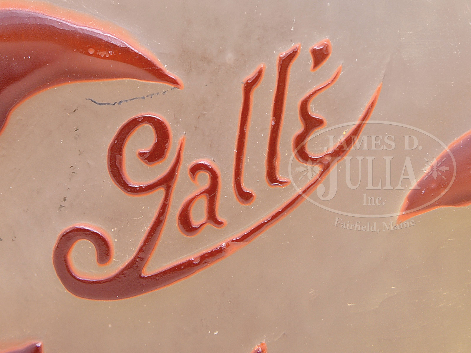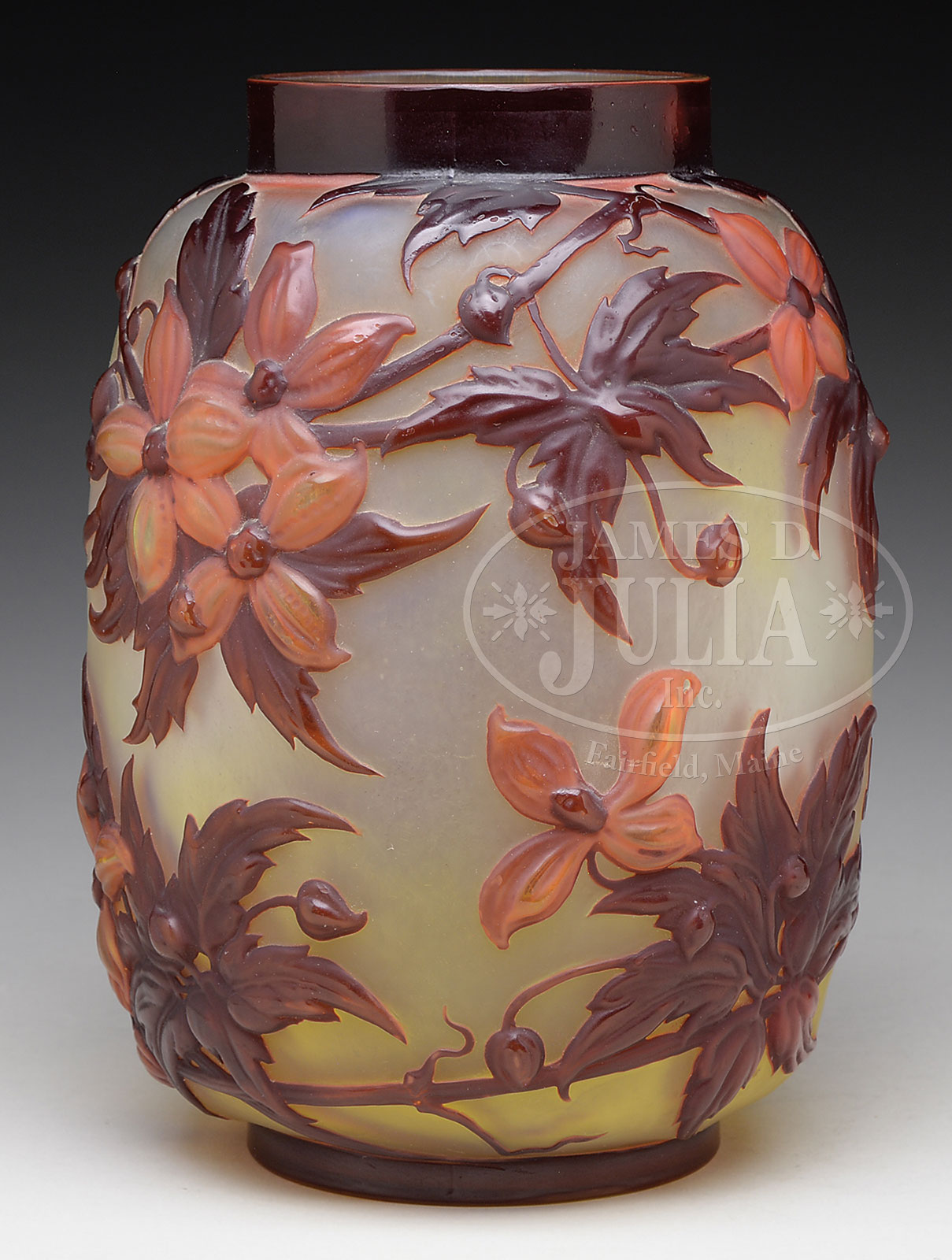 GALLE MOLD BLOWN CLEMATIS VASE.Galle mold blown vase has brownish red clematis leaves and vines with salmon colored clematis flowers, all against a frosted background with yellow tint at top and bottom. Vase is signed on the side in cameo “Galle”. SIZE: 9-3/4″ t. CONDITION: Very good to excellent. 52017-9 (7,500-9,500) – Lot 1570
