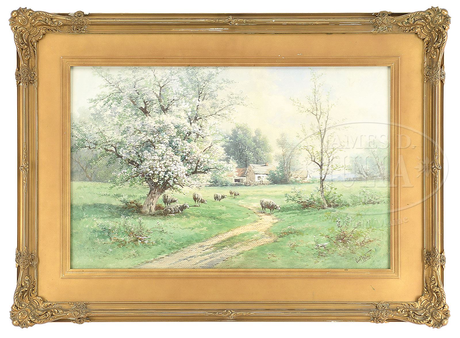 CARL PHILIPP WEBER (American, 1850-1921) SHEEP IN A LANDSCAPE. Watercolor Housed in its original gesso decorated gilt frame with minor losses Signed lower right “Carl Weber” SIZE: 18″ x 28″. Overall: 27-1/2″ x 37-1/2″ PROVENANCE: From a fine Kentucky Estate. CONDITION: Very good 9-92862 (600-900)