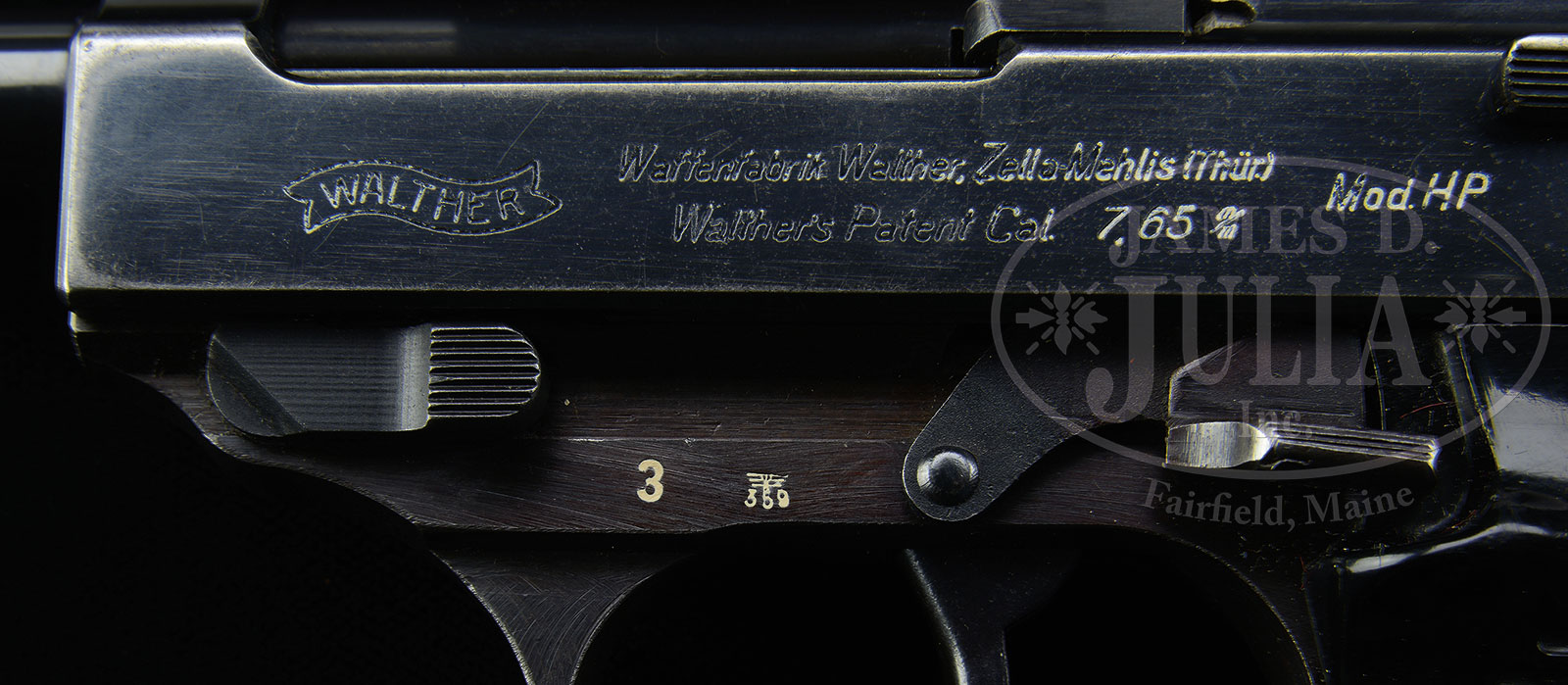*RARE SPECIAL ORDER WALTHER HP CAL 7.65 SERIAL NUMBER 3.SN 3. 7.65 Cal. 5″ bbl. High Gloss blue finish on slide and barrel dull blue on frame. This rare gun is known as a hybrid according to Warren Buxton. This Rare pistol is pictured in Volume One page 136 of “The P.38 Pistol” by Warren Buxton. He notes that this gun is a combination of both early .30 cal, parts and later P.38 parts. Frame is number 3 slide is number 3011 barrel is number 2081. He also states that there are less than 6 known to have been reported. These guns all have mixed serial numbers and where produced from 1942 through 1945.Proofs include Eagle over “N” as well as the Waffen 359 inspection. This is a rare opportunity to own one of the rarest of all Walther Pistols that is well known and prominently pictured on 4 full pages of his in depth book. PROVENANCE: The Esteemed Collection of Noted Expert And Author Warren Buxton. CONDITION: Very fine overall with mixed numbers. High gloss blue finish has edge wear on corners and muzzle. Some very small pin prick pitting exist but is period and extremely minor. Frame is slightly purplish with worn thin finish on front strap. Grips are very fine with slight edge wear and minor scratches. Bore and mechanics are excellent. 51568-61 TDW (6,500-9,500) C&R – Lot 1572