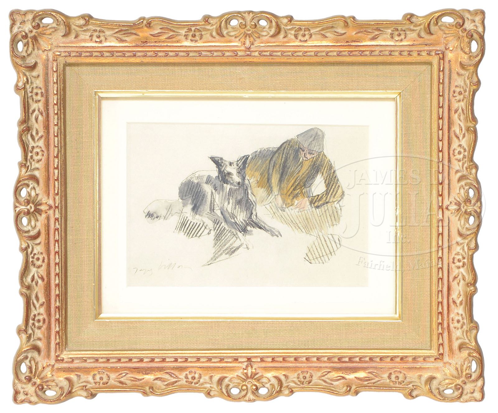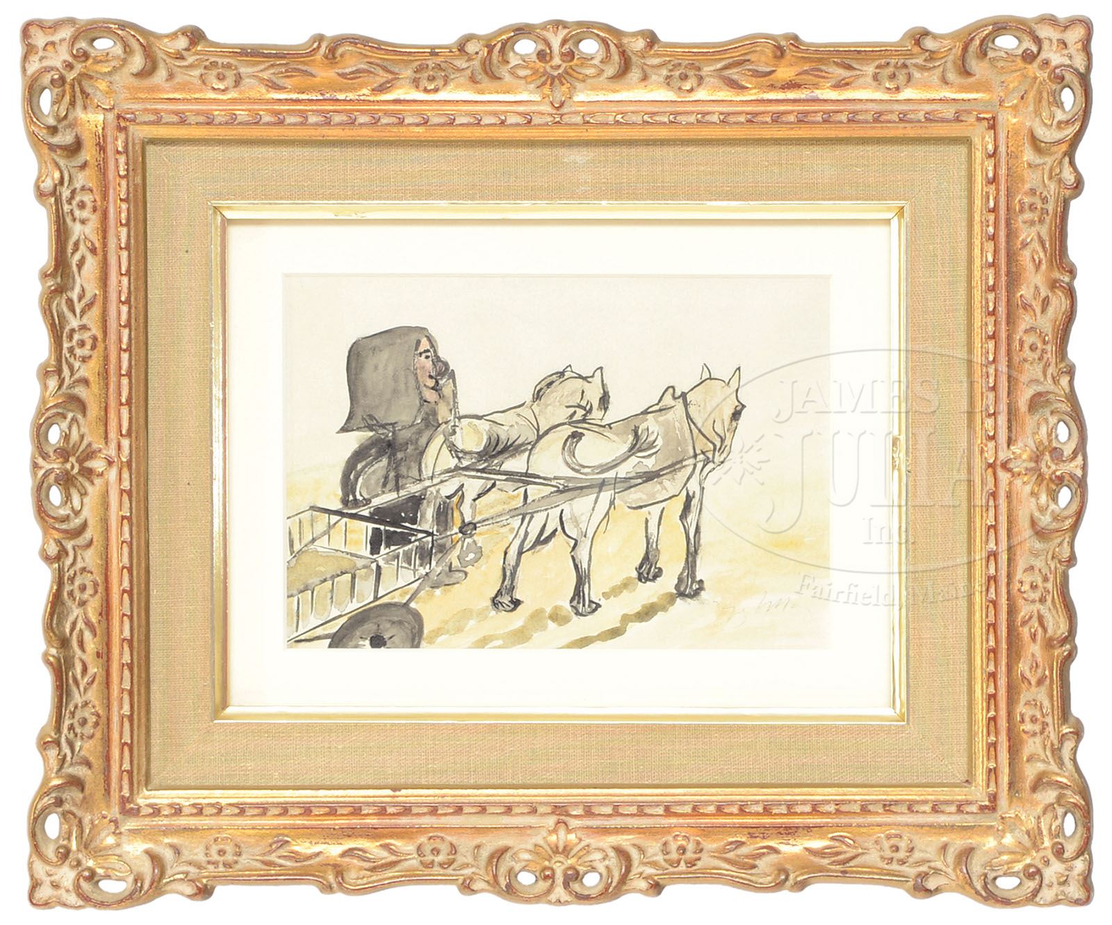 JACQUES VILLON (French, 1875-1963) TWO WORKS: MAN WITH DOG AND HORSE CART. Watercolor and pencil on paper Housed in identical modern frames with linen and gold liner with white matte behind glass Pencil signed “Jacques Villon”, bottom left and bottom right SIZE: Sight: 4-1/4″ x 6-1/4″. Overall: 10″ x 12″ CONDITION: Very good 9-29436 (800-1,200)