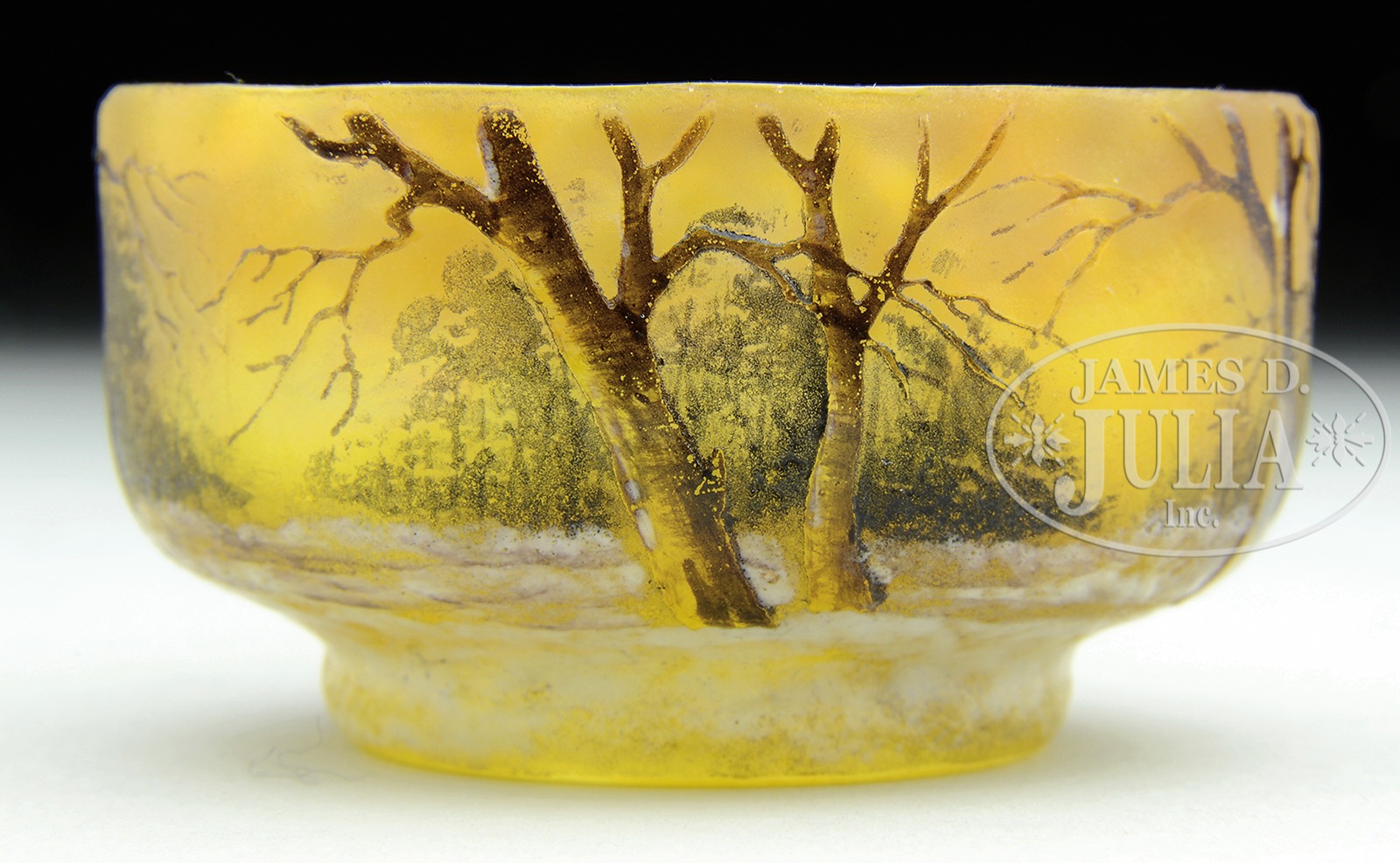 DAUM WINTER SCENE SALT.Daum salt has cameo and enameled winter scene with barren trees rising from a snow covered ground. The cameo trees are enameled in shades of brown with patches of white enameled snow clinging to the branches. All set against a mottled yellow and orange background. Signed on the underside in black enamel “Daum Nancy” with the cross of Lorraine. SIZE: 2″ dia. CONDITION: Very good to excellent. 1101-65 (1,350-1,650) – Lot 1573