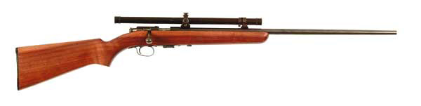 *WINCHESTER MODEL 697 BOLT ACTION RIFLE. Cal. 22. Scarce little rifle with 25-1/8″ tapered round bbl, no bbl sights with Winchester A-5 scope on target blocks mounted to the bbl. Rear receiver bridge has a dovetail with slot blank, mounted in a standard Model 69 smooth stock with pistol grip and Winchester hard rubber buttplate. Accompanied by a 5-shot magazine marked “69”. NSN. CONDITION: Metal is excellent. Retains 96-98% original blue with some scattered very fine, light, cleaned surface rust. Stock is sound and retains most of its original finish with light use and handling marks, plugged sling swivel holes in the buttstock and forearm. Scope retains 96-97% original black paint with good optics. Bright shiny bore. 4-47018 JR395 (1,500-2,500)