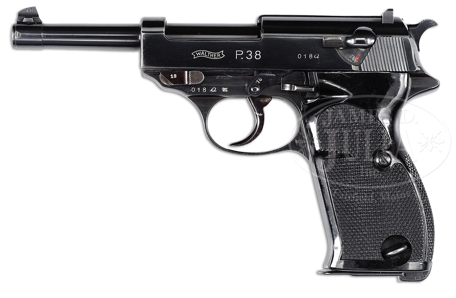*IMPORTANT WALTHER P.38 PROTOTYPE PISTOL, “0” SERIES WITH LETTER SUFFIX.SN 018A. Cal. 9mm. A few early development stage pistols were marked with a lower case letter “a” suffixed to the SN by hand after the guns were assembled. This was used to indicate that the gun had been further modified. It was Buxton’s opinion that the “a” suffixed developmental pistols had their modifications directed to the safety and firing systems, particularly as related to the retractable firing pin. This particular pistol is a later prototype with heavy slide, internal extractor, and rectangular firing pin. By this time the hammer had transitioned to the standard form though the 5″ bbl still has the early, lightened lug extension. The left side of the slide is marked with Walther banner and “P 38” followed by the SN “018a”. The right side of the slide has two” Eagle/359″ acceptance marks along with a “Crown/N”. Internal extractor and narrow rear sight. The “Eagle/359” proof is on the left side of the frame just behind the dismounting lever. The full SN “018A” appears on the left side of the frame, under the bbl, and under the locking lug with the abbreviated “18” on the top of the sight, transfer bar, take-down lever, slide release, and mag release. Early black plastic checkered grips, each panel numbered “18” and accepted with an “Eagle/359”. Mag is from a later gun, having a matte finished body, with “060” marked on the left side and “Eagle/359” on the lower spine. PROVENANCE: The Esteemed Collection Of Noted Expert And Author Warren Buxton; Pictured in Warren Buxton’s book “The P.38 Pistol, Volume III” pg 201. CONDITION: Approximately 97-98% bright orig blue, with two dings on the left side of the muzzle and sharp edge wear in the usual places as expected from careful handling. Excellent orig grips with crisp checkering and comparable condition mag. A wonderful early experimental P.38 that would grace the most advanced collection. 51568-5 LMA (20,000-30,000) C&R – Lot 1580